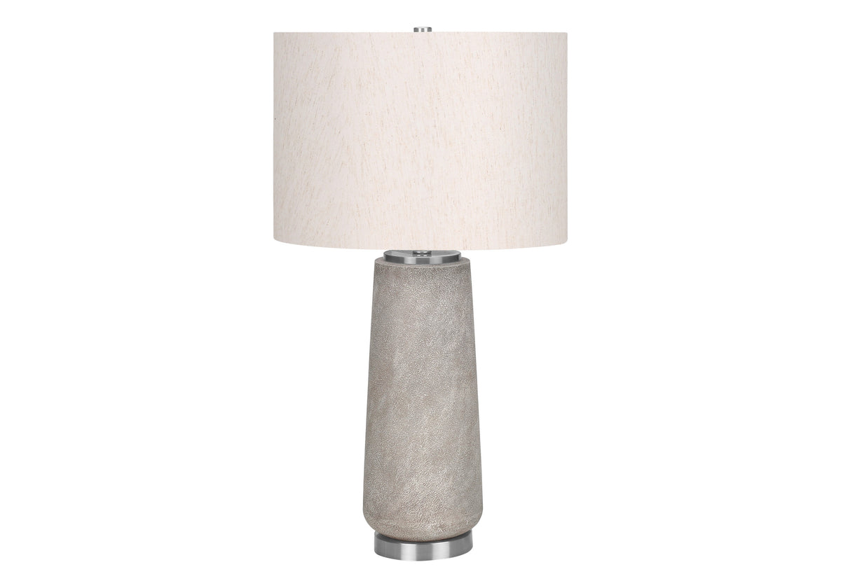 Bring of level of elegance and freshness to your space with this high quality 29-inch gray and silver cylinder table lamp with ivory drum shade. The lamp is made of sturdy resin and features a gray and silver color. Includes a ivory linen, drum shaped shade, making this a fashionable piece that will complement most any interior. This standard table lamp is designed to provide general lighting to the area. The light that this lamp throws is soft and warm to elevate the look of most any space in your home. Bring some lite and good vibes into your space with this updated and stylishly designed lamp. 29-inch H x 16-inch W x 16-inch D