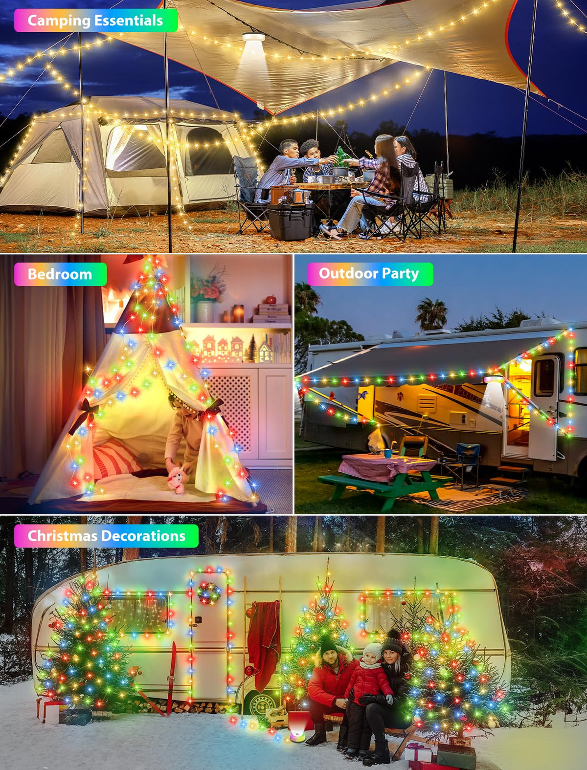 Camping String Lights, 4 in 1 Quick Storage 32.8FT Rechargeable Tent Lights with 9 Modes Hanging Waterproof Camp Lamp Camping Essentials for AwnTent Hiking Garden Bedroom Festival(Warm +RGB)-2Pack