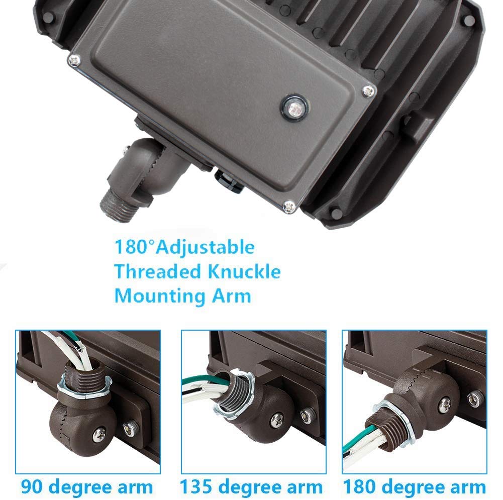 100W LED flood light emits a wide beam of 5000K Daylight illumination for landscape lighting, parking lot lighting, tree uplighting, flagpole lighting, and architectural wall washing. The powerful LED fixture emits 14,000 lumens for ample outdoor illumination. The weatherproof LED fixture is constructed of heavy-duty die cast aluminum with an integral heat sink. This LED flood light is also equipped constant-current driver. An adjustable mounting bracket allows you to direct illumination where it's needed. The LED fixture is designed to last 3 times longer than HID fixtures. LED Floodlight Wattage: 100 Watts Input Voltage: 100-277V Lumens: 14,000 lm Efficacy: up to 140lm/W CCT: 5000K CRI: Minimum 80 CRI Power Factor: > 0.90 Lifetime: Estimated 50,000 Hours Replaces: Comparable to 1000W PSMH(Pulse Start Metal Halide) Waterproof: IP65 Wet Location Operating Temperature: -40°F (-40°C) to 113°F (45°C) Lens: Polycabonate, Suitable for outdoor use with respect to exposure to Ultraviolet Light, Water Exposure and Immersion in accordance Durable Housing: Heavy-Duty die cast aluminum housing Heat Sink: Designed to keep the LEDs cool for longer life Sealed Housing: Weatherproof and Durable Silicone Rubber Gaskets keeps dust out Mounting: 1/2” Knuckle Mount Finish: Dark Bronze