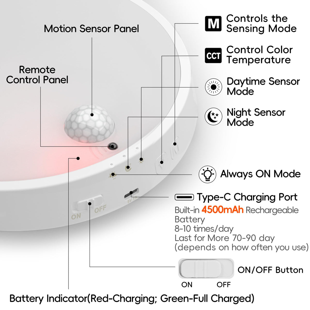 ?Auto Mode?This Led Ceiling Light Has Auto And On Two Modes. Auto Mode--When Motion Is Detected Within A Range Of 10-18 Feet, It Will Activated And Automatically Turns Off 20 Seconds After The Motion Has Stopped. Under Auto Mode, Motion Sensor Will Only Work In Dark Environment, Conserving Battery Life.