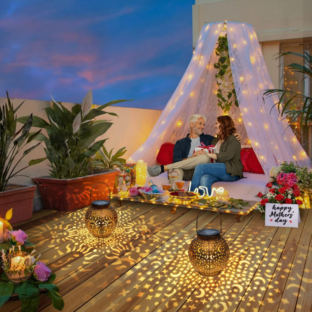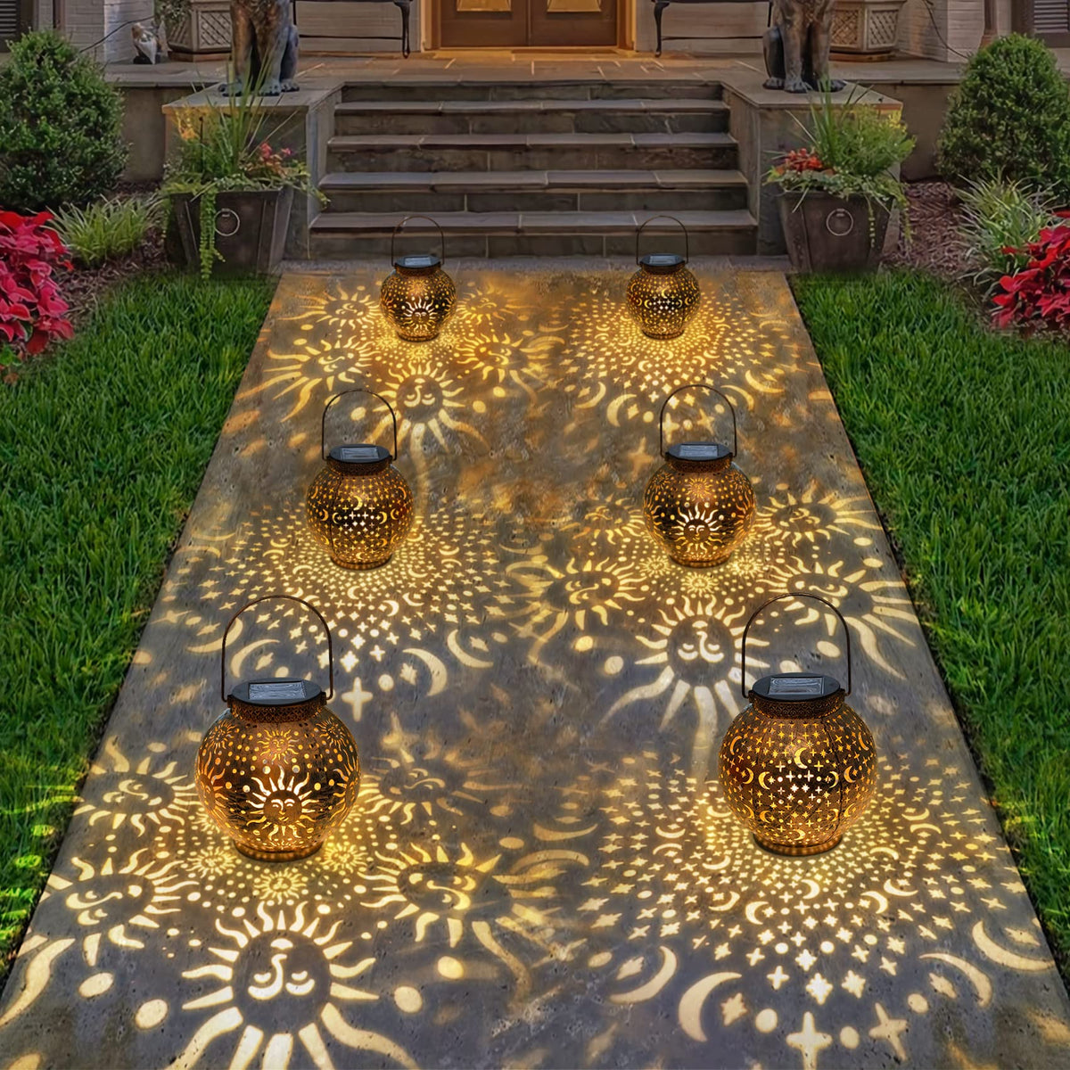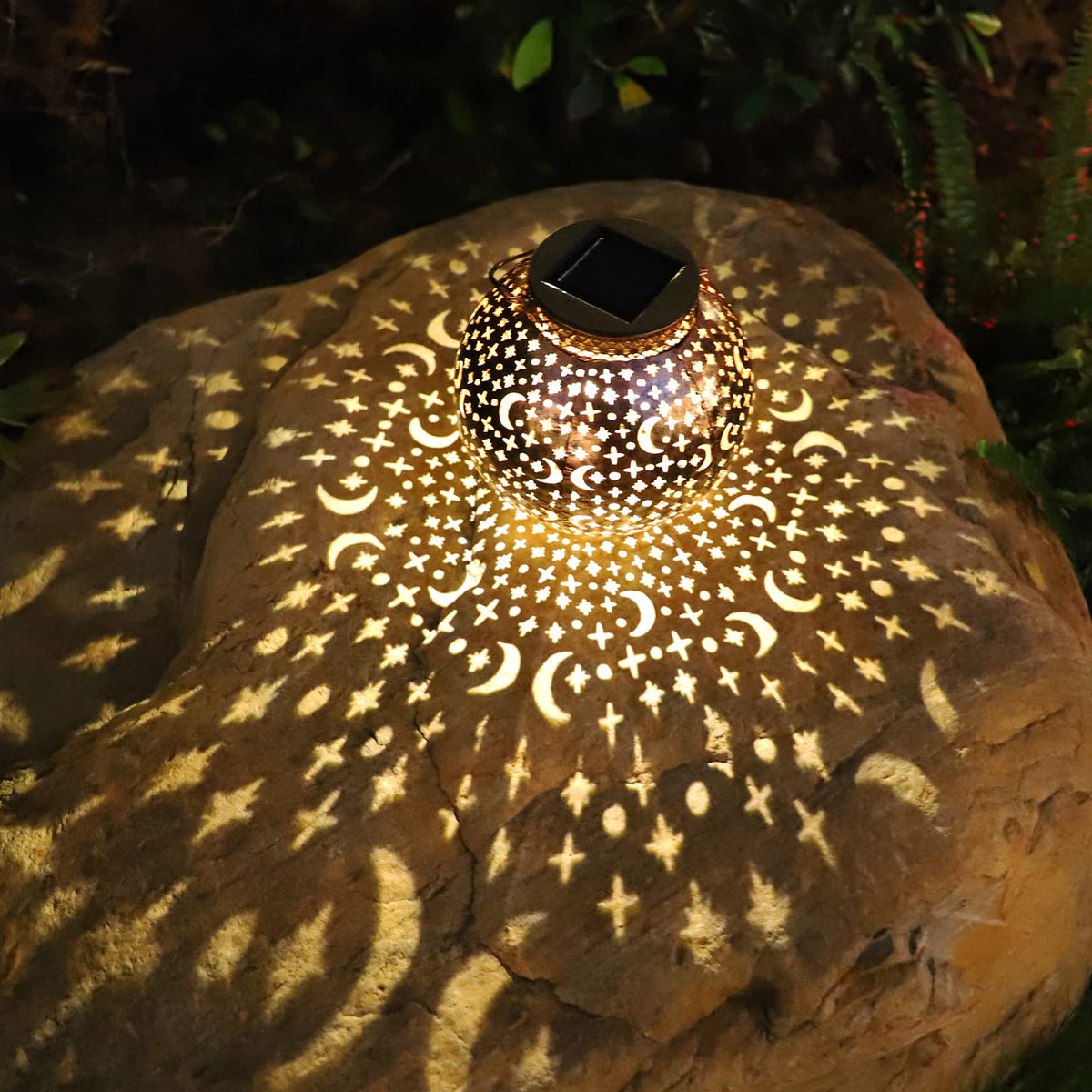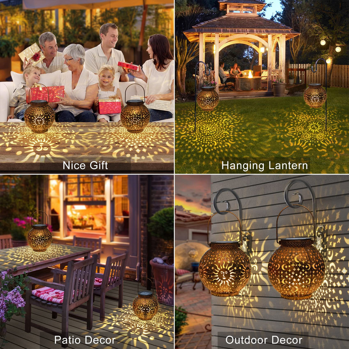 The Item is Hot-selling and Low-Stock, Order it Now! Don't miss the Gorgeous lanterns. Unique New Design: Exclusive copyright, intellectual property protection. The solar powered lanterns comes with moon star and sun hollow design, cast pretty pattern and create warm and pleasant atmosphere for your patio.Package:1 x moon star lantern, 1 x sun lantern. Lantern Diameter 6.1in, Lantern Height 6.1 inch(not include handle) | The 8 Lumens Decorative solar hanging lanterns outdoor emit soft yellow glow, add a peaceful and romantic ambience for your garden, yard and pathway. It is a best gift for mother’s day, father's day, birthday, christmas, thanksgiving, holiday, anniversary or any other special festival. | Stylish Solar outdoor lanterns: the table outdoor lights made with quality metal. The bronze finish offer a antique, stylish look. The lovely lantern features at water-resistant and weather-resistant, could be a nice outdoor decoration through out the whole year. | Easy to install: Super easy to use, no wire, save energy, eco-friendly. Package: 1*Moon Star Lantern and 1* Sun Lantern. The hanging solar lanterns is perfect gift for kids and adults. | When you receive these lovely lantern, just keep the solar panel in the darkness, then the lights will light up. Simply contact us to get free replacement if you ever have issues with your Go2garden outdoor solar lanterns.