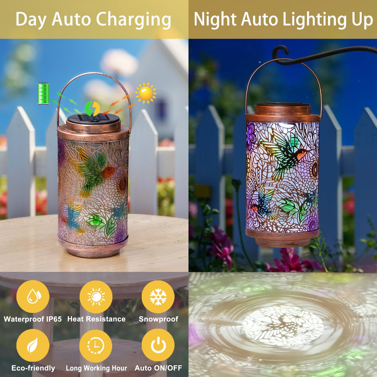 Q: What makes the hummingbird solar lanterns unique for outdoor decoration?A: The hummingbird solar lanterns feature a delicate hollow design that produces beautiful patterns when hung near walls or floors. Their unique colorful craftsmanship gives them an attractive look, resembling real flying birds, making them a standout choice for outdoor decor.