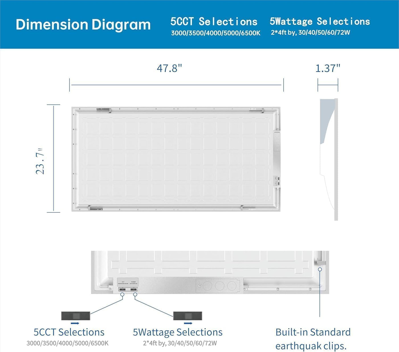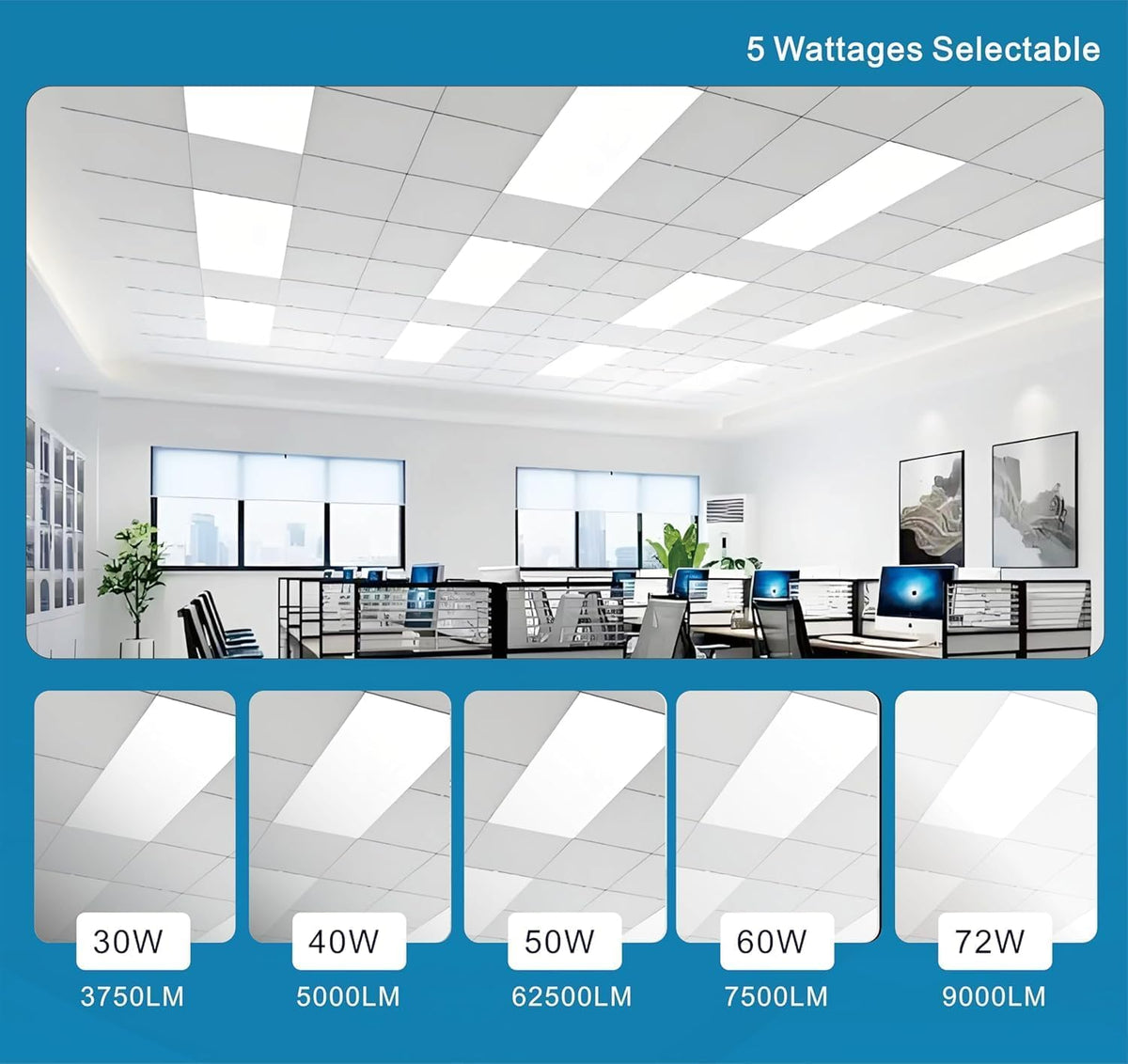 Q: What are the wattage options for this panel light?A: The LED flat panel light is wattage selectable, allowing you to choose between 30W, 40W, 50W, 60W, and 72W. Each wattage option provides specific lumens output, with 30W delivering 3750 lumens and 72W providing 9000 lumens.