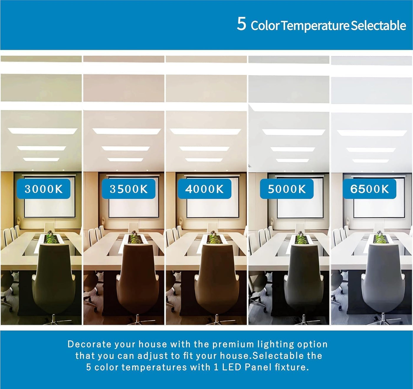 Q: What are the different color temperatures available for this LED flat panel light?A: This 2x4 FT LED flat panel light offers adjustable color temperatures of 3000K, 3500K, 4000K, 5000K, and 6500K. You can easily select your desired color temperature before installation using a switch on the driver box.