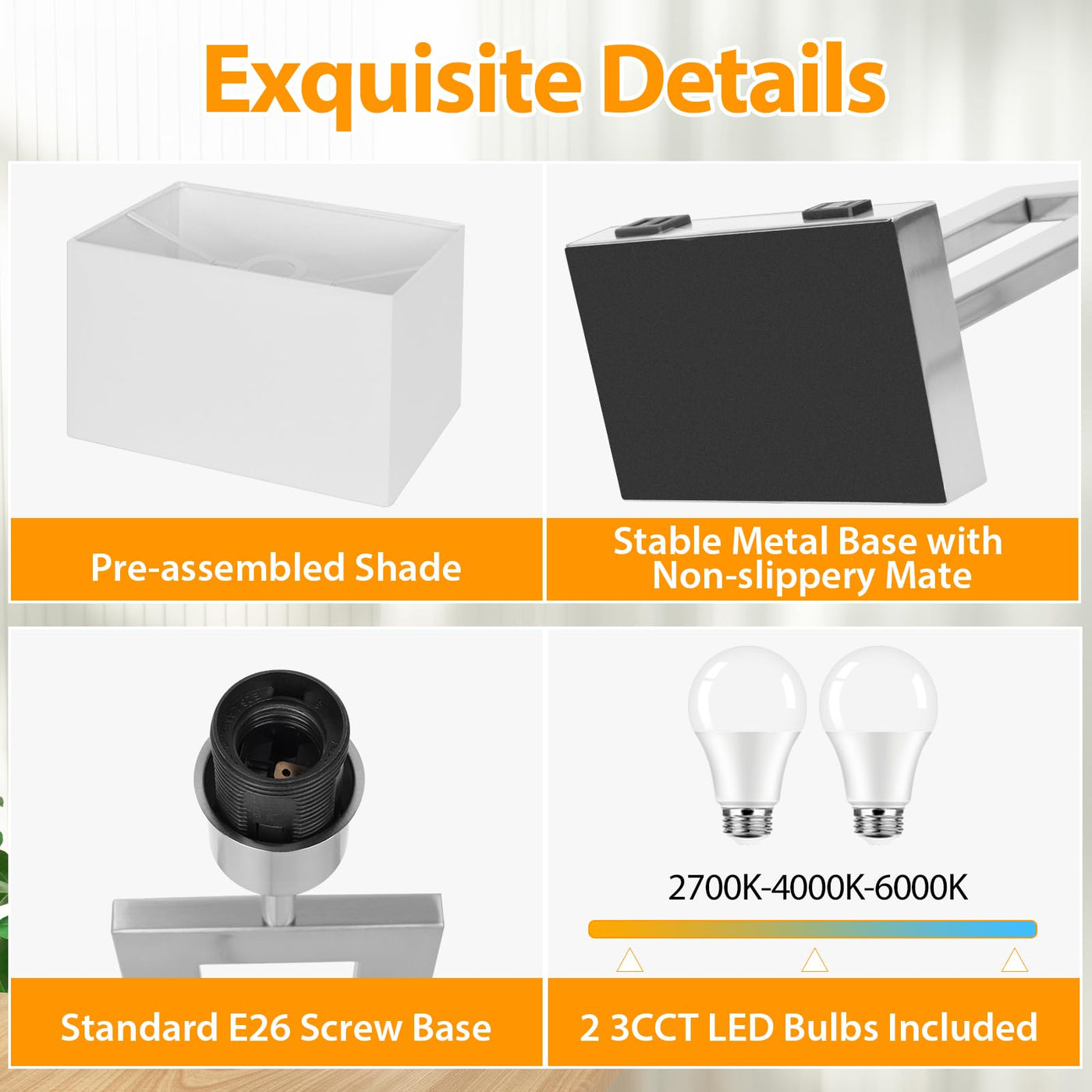 Q: Are the included bulbs energy-efficient?A: Yes, the lamps come with two energy-efficient 9W LED bulbs that provide the equivalent brightness of 100W incandescent bulbs while saving over 90% on energy costs. They also have a long lifespan of over 25,000 hours.