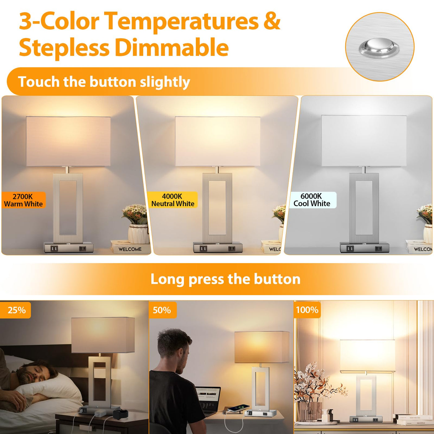 Q: What are the color temperature options for these table lamps?A: These table lamps offer three adjustable color temperatures: 2700K warm white for reading and sleeping, 4000K neutral white for working and studying, and 6000K cool white for general use at home or in the office.