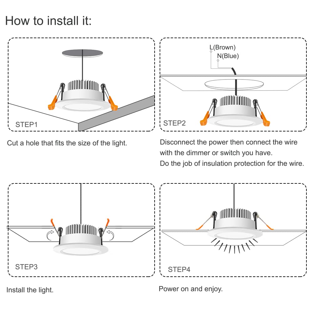 Q: Are these lights easy to install?A: Yes, the recessed LED lights are designed for easy installation. They can be fitted to replace ordinary 2.56 - 3 inch recessed light fixtures without requiring extra recessed housing cans or accessories.