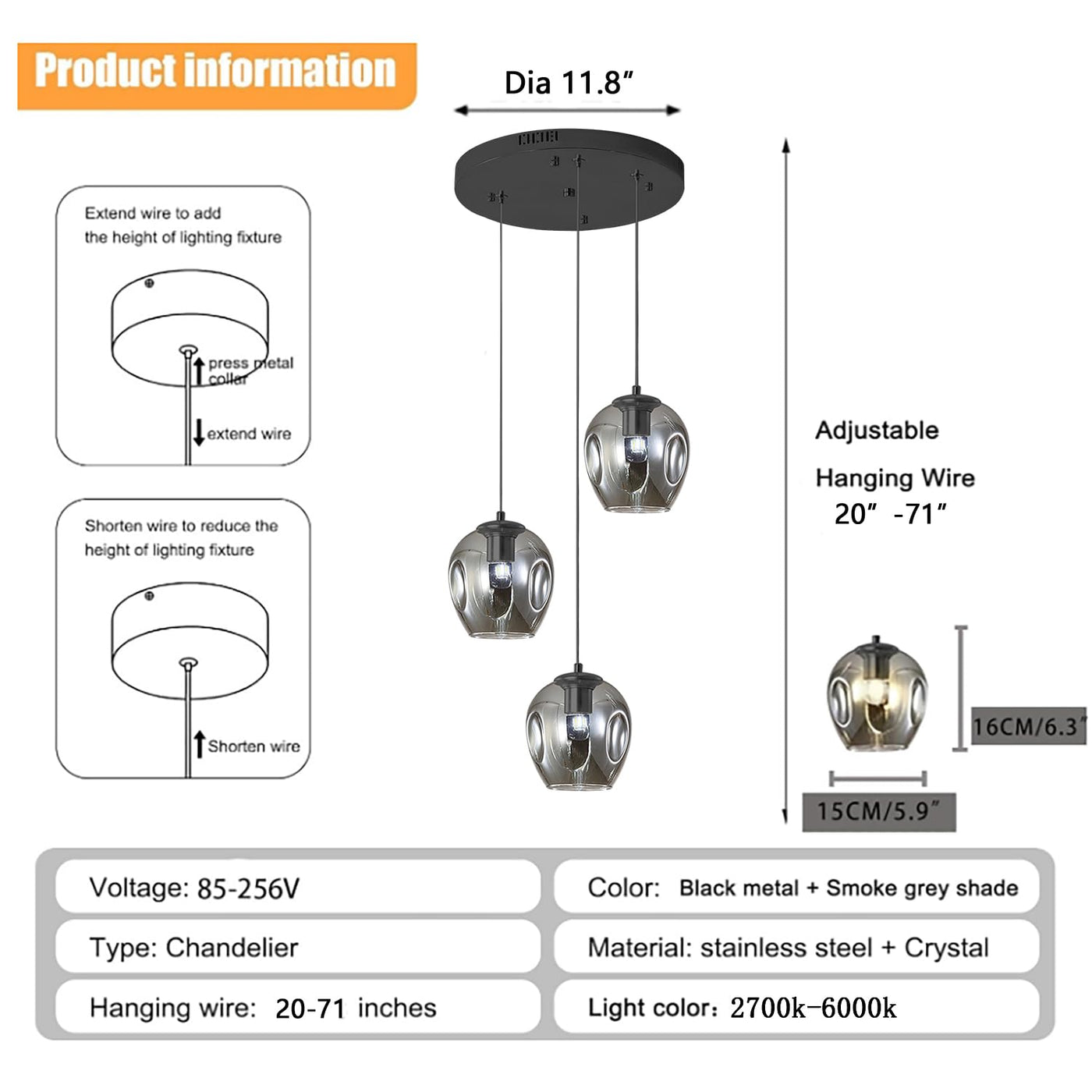 3-Light Black Chandelier With Led Bulbs & Smoke Gray Glass Shade Ceiling Light Pendant Light For Kitchen Island, Dining Room, Li