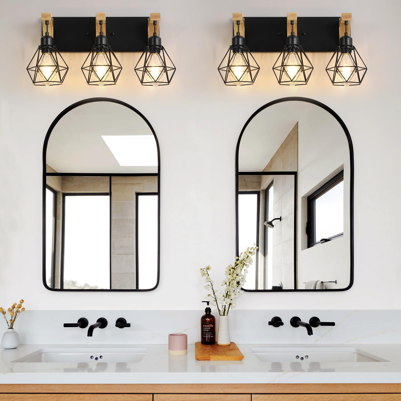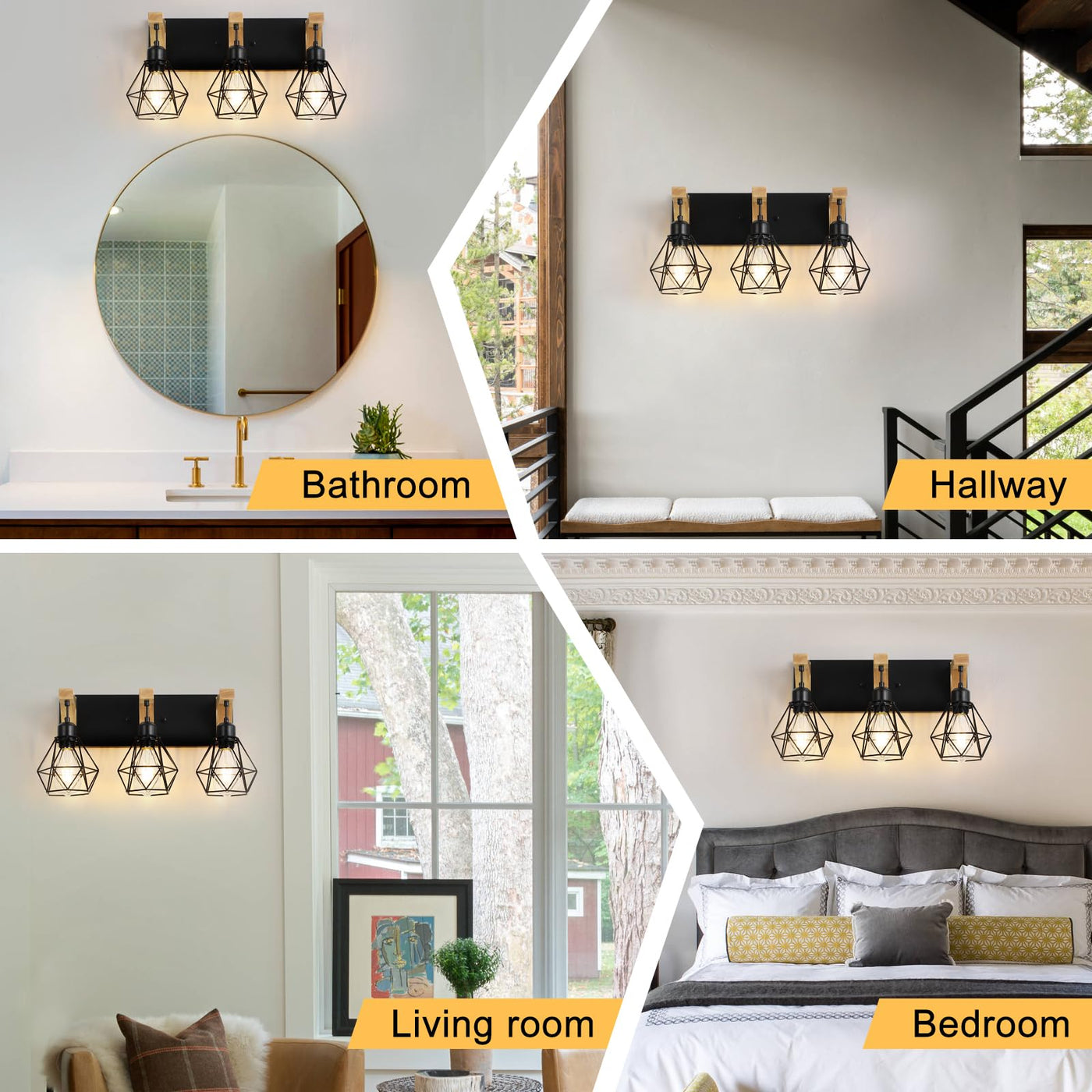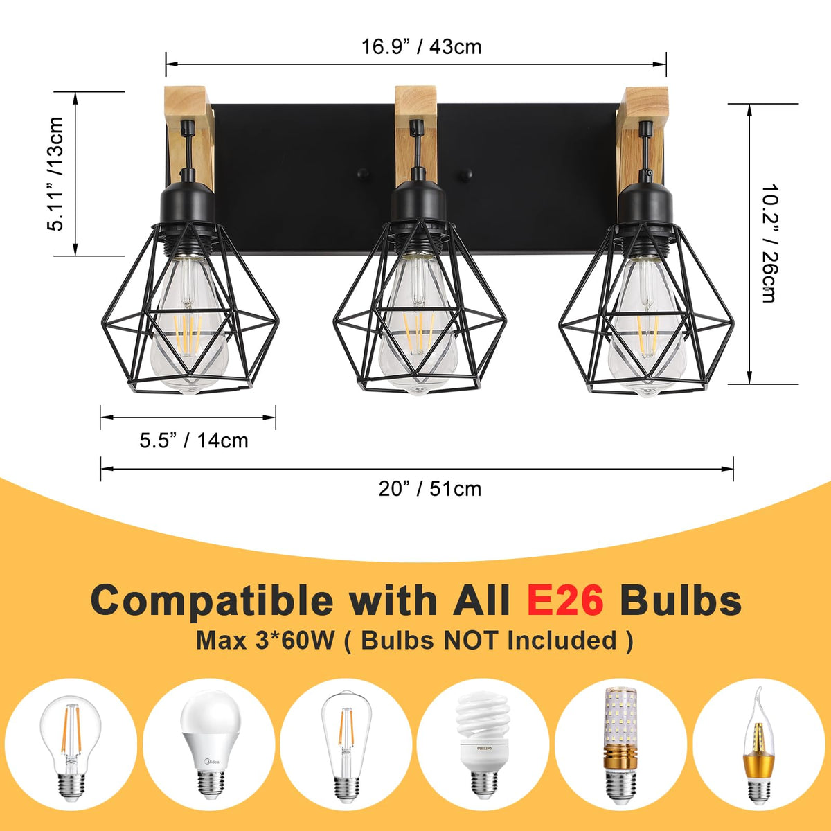 3-Light Farmhouse Bathroom Vanity Light Fixtures, Wood Bathroom Light Over Mirror, Rustic Sconces Wall Lighting With Elegant Met