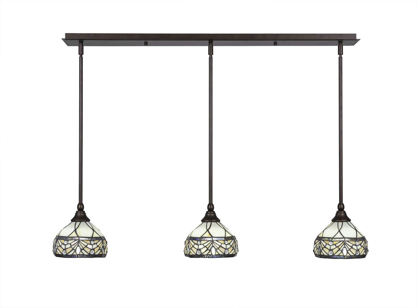 Q: What style does the 3 Light Linear Pendalier complement?A: The bronze finish and Royal Merlot art glass design of the 3 Light Linear Pendalier make it a perfect fit for traditional, rustic, or industrial decor styles, enhancing the aesthetic of any island or dining area.