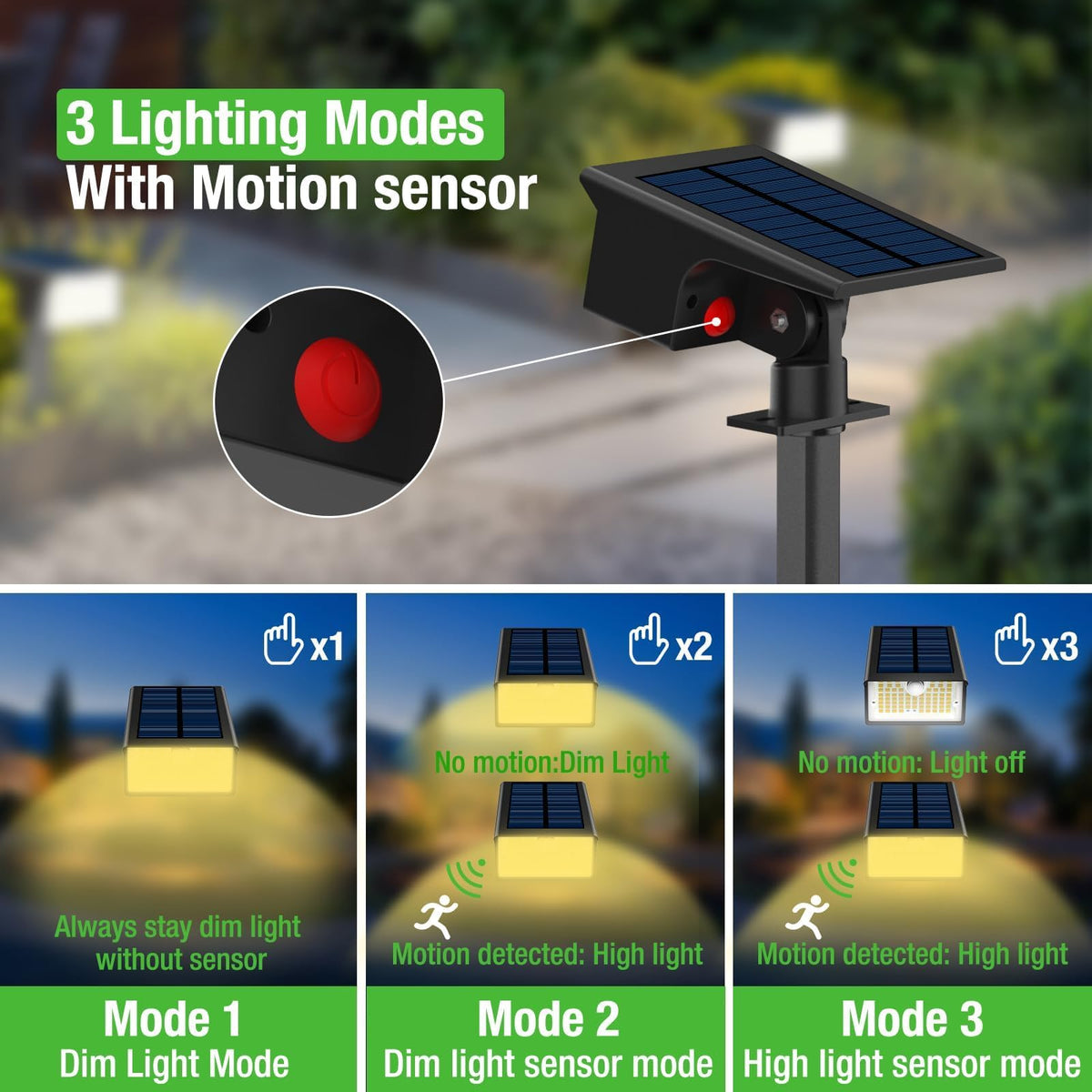 Q: What are the different modes available for these solar lights?A: These solar spotlights feature three lighting modes: 1) Stay dim brightness at night without motion detection, 2) Dim brightness sensor mode, and 3) Security motion sensor mode, allowing you to choose the best setting for your needs.