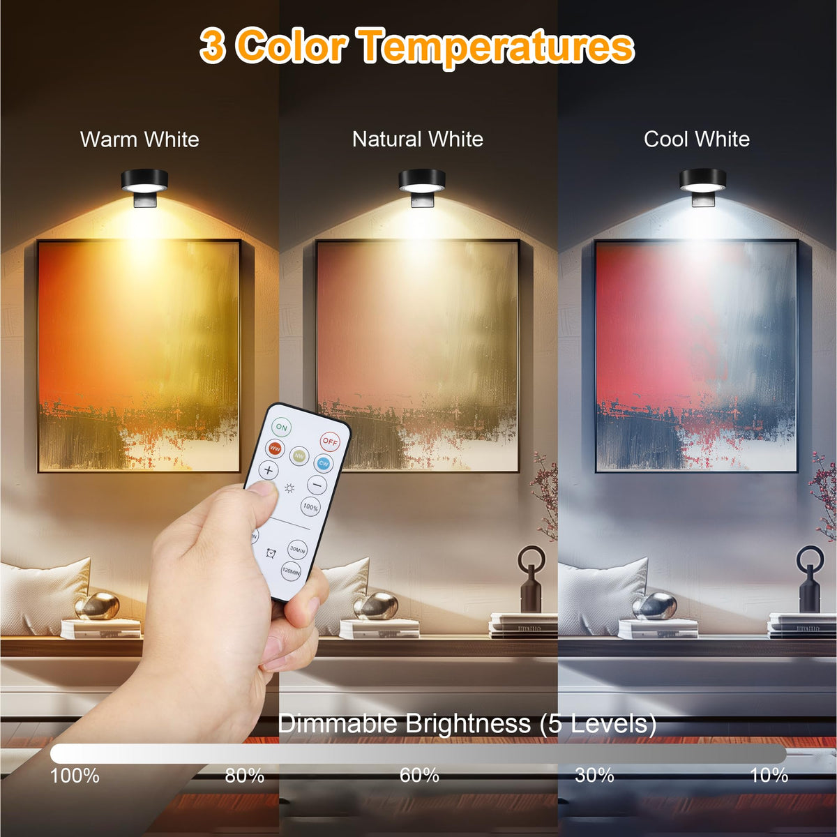 Q: What are the different lighting modes available?A: The picture lights offer three color temperature modes: warm white, natural white, and cool white, so you can choose the ambiance that best suits your space.