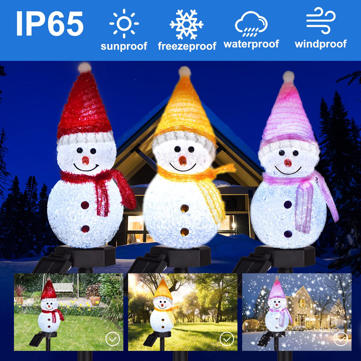 Q: What colors are available for the snowman hats and scarves?A: The snowman pathway lights feature a variety of colorful hats and scarves, including red, yellow, and pink, adding a festive touch to your outdoor decorations for Christmas.