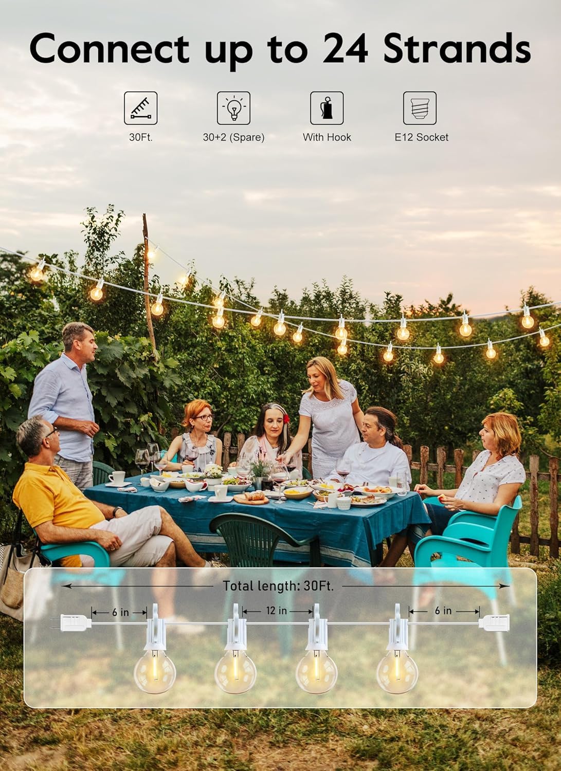 Q: Can I connect multiple strands of these patio lights together?A: Absolutely! You can connect up to 24 strands of these outdoor string lights end to end, allowing you to create a more extensive lighting setup for your backyard or event.