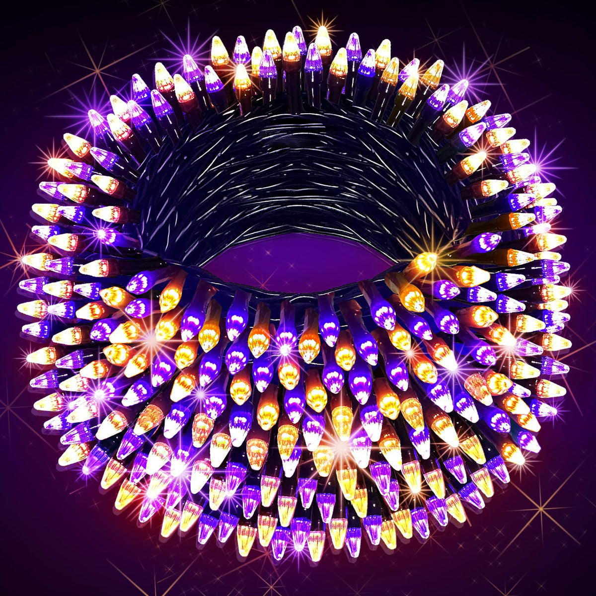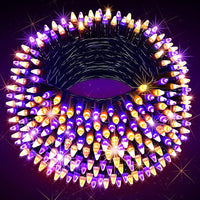The 300 LED Halloween lights feature a mix of vibrant purple and orange LEDs, perfect for creating a spooky and festive atmosphere. With a 100ft dark wire that blends well with outdoor or indoor settings, these lights are ideal for decorating trees, porches, fences, and pathways. They offer multiple lighting modes to match any Halloween theme and are built with energy-efficient LED technology. Waterproof and durable, they ensure reliable performance through all weather conditions, making them perfect for your Halloween decor needs.