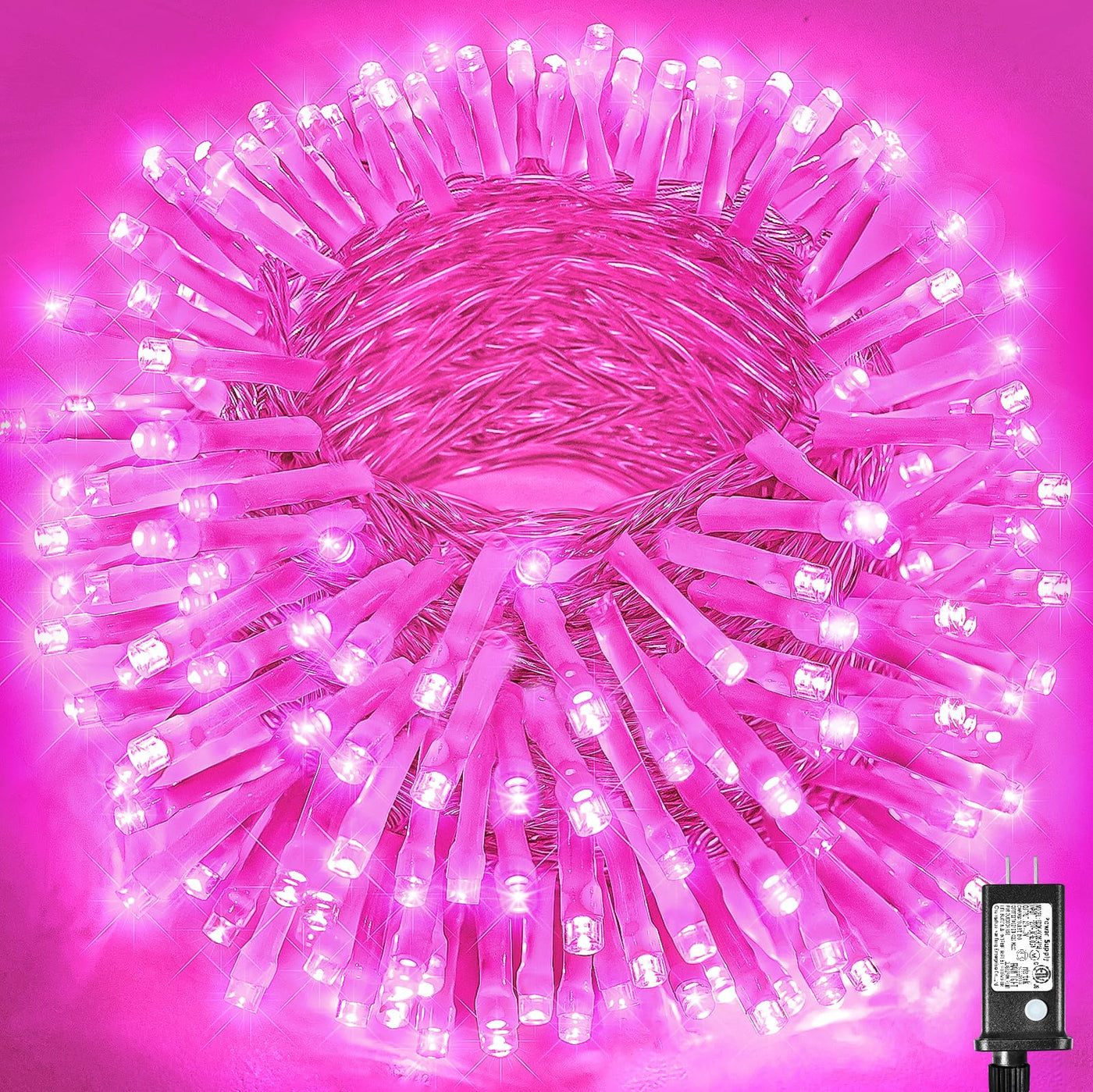 Q: What are the key features of the 300 LED Pink String Lights?A: The 300 LED Pink String Lights feature 300 LEDs with a total length of 99ft (30m of lights plus a 10ft lead wire). They have 8 different lighting modes, including twinkle and steady on, and come with a waterproof UL listed plug suitable for outdoor use.