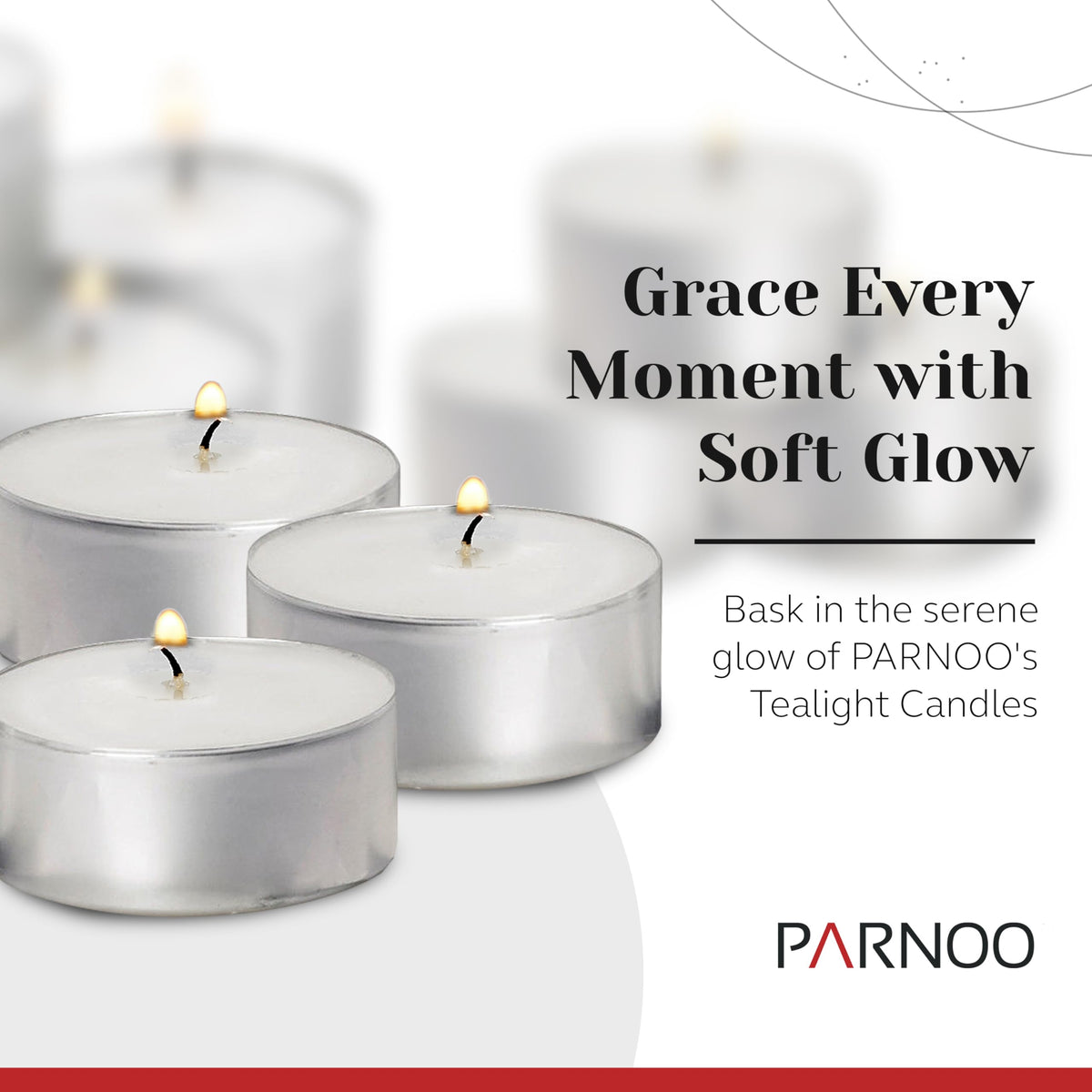 Illuminate Can-Delight Moments with PARNOO's Tealight Candles Brighten every corner of your life with PARNOO's premium collection of white tea lights. Each small candle sits snugly in a metal cup, ensuring stability and ease of placement in a variety of settings, from tealight candle holder to mason jars. Whether you're setting the mood for a romantic dinner, lighting up a cozy lantern, keeping your food warm, or preparing for an unexpected power outage, these bulk candles are your go-to solution. Experience the serenity of clean, soot-free burning with our meticulously crafted candle pack. Our unscented votive candles and tea lights candles promise an ambiance free from clogged nostrils and unsightly stains, ensuring a pure and unadulterated glow. Our long burning candles are designed to last. Crafted from high-quality wax with a lead-free cotton wick, these long lasting candles promise a continuous, steady flame for up to 4.5 hours. Say goodbye to frequent relighting and embrace uninterrupted warmth and candle light, making them perfect as both romantic candles and emergency candles long burning. Our long lasting tea lights serve as the ultimate accessory for creating a magical atmosphere. Ideal for grand occasions or intimate moments, these small tea light candles transform any space into a haven of relaxation and romance. Product Features Clean Burning Unscented Long Burn Time Soft Glow Wax & Lead-Free Cotton Encased in Metal Cups Fits Most Standard Votive Holders Lanterns Mason Jars Potpourri Burners Luminaries Romantic Centerpiece Other Decorative Holders About Us Discover the world of PARNOO, where we bring you a diverse selection of candles that effortlessly enhance any atmosphere, decor theme, and occasion. We believe in creating a timeless ambiance that you can share with your loved ones. At PARNOO, each flicker of our candles transforms moments into connections and celebrations, enriching the beauty and elegance of your gatherings.