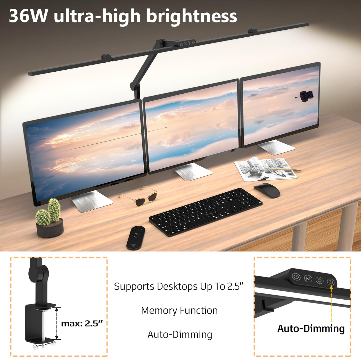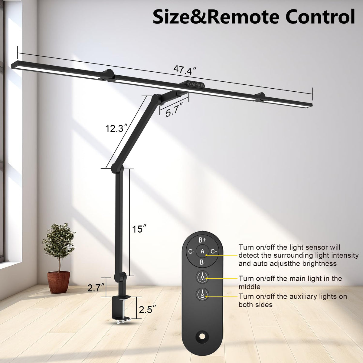 Q: Is the lamp compatible with different desk sizes?A: Absolutely! The lamp is designed to be adjustable up to 47.4 inches long and 29.9 inches high, making it suitable for various desk sizes and configurations without obstructing your view of monitors.