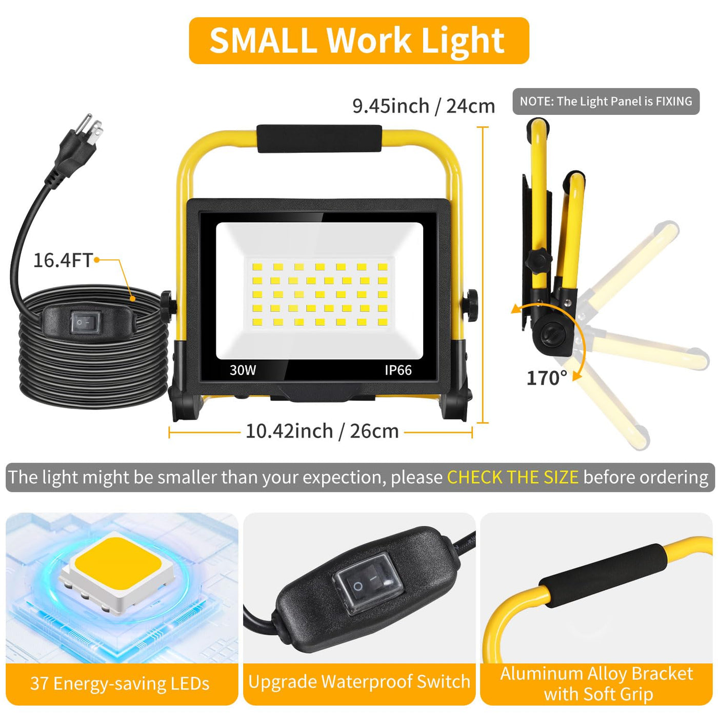 Specifications Luminous Power: 30W Color Temperature: 5000K Daylight White Lumen: 3600Lm Premuim Led Chips: 37Pcs Waterproof: Ip66 Power Cord Length: 16.4Ft/5M Material: Aluminum + Tempered Glass Applications: Suitable For Many Occasions Where Visibility Is Crucial Such As Construction Sites, Car Repairing, Interior Renovation, Wall Painting, Factories, Warehouses, Garages, Workshop, Camping, Fishing, Basement And Backyard