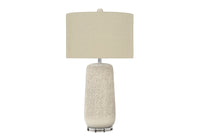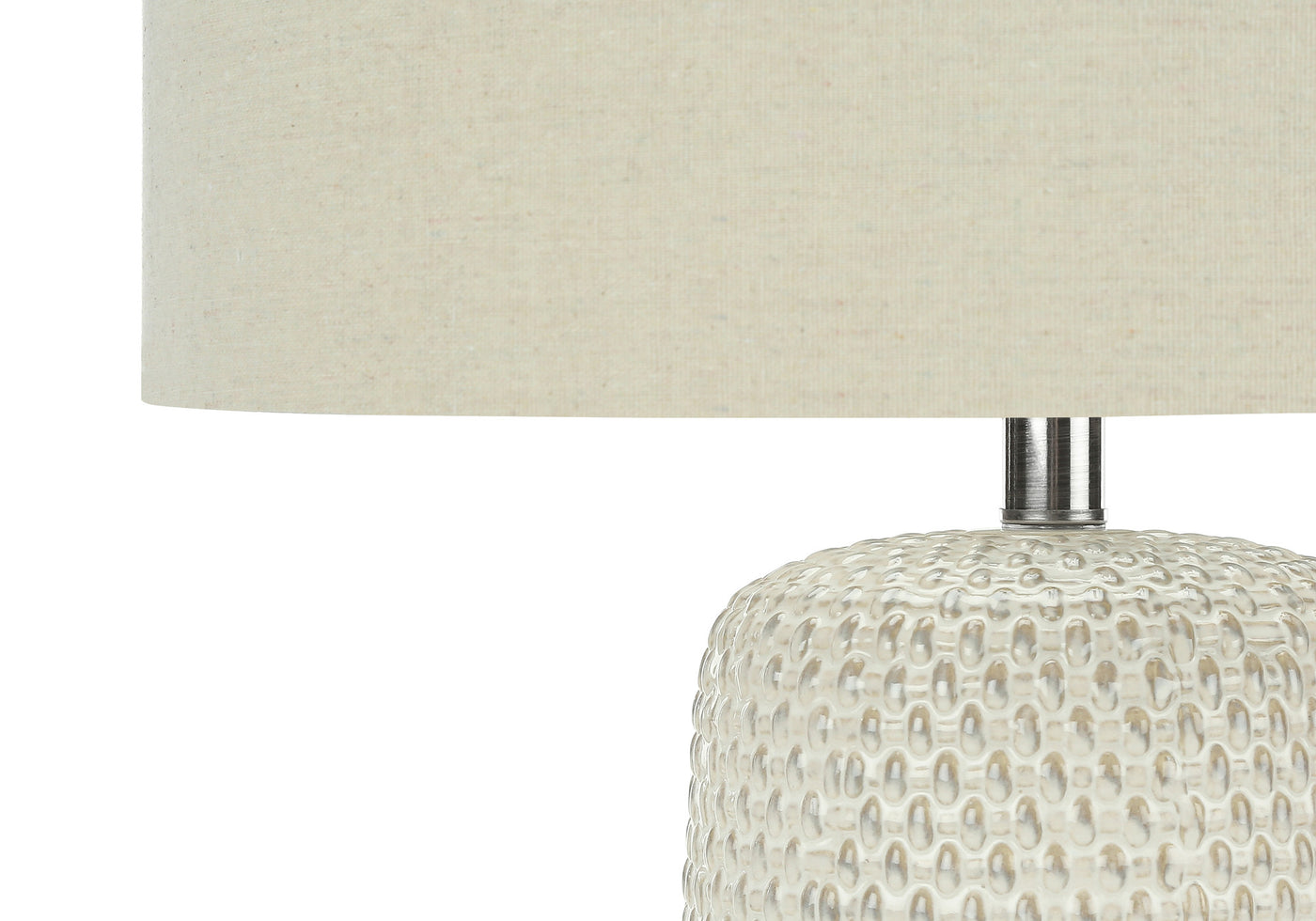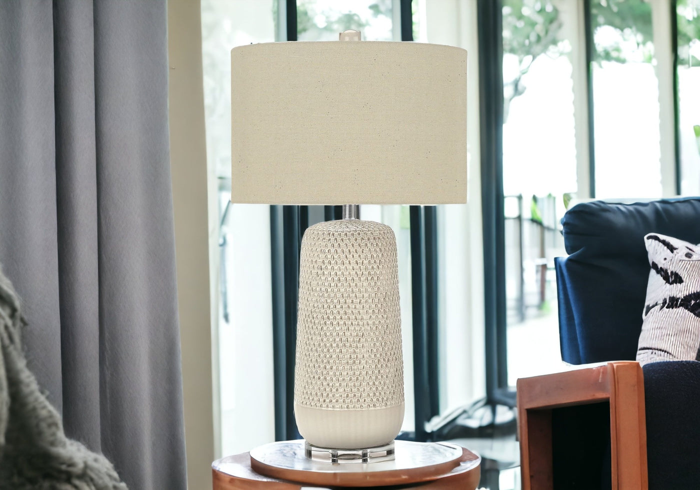 Embrace the good life with this hard working and stylish 31-inch cream ceramic geometric table lamp with beige drum shade. A gorgeous cream ceramic base brings just the right amount of pizzazz to this fabulous lamp. Includes a beige linen, drum shaped shade, making this a fashionable piece that will complement most any interior. This standard table lamp is designed to provide general lighting to the area. Use this lamp anywhere and elevate the look of the whole space. It is perfect for virtually any decor. 31-inch H x 17-inch W x 17-inch D