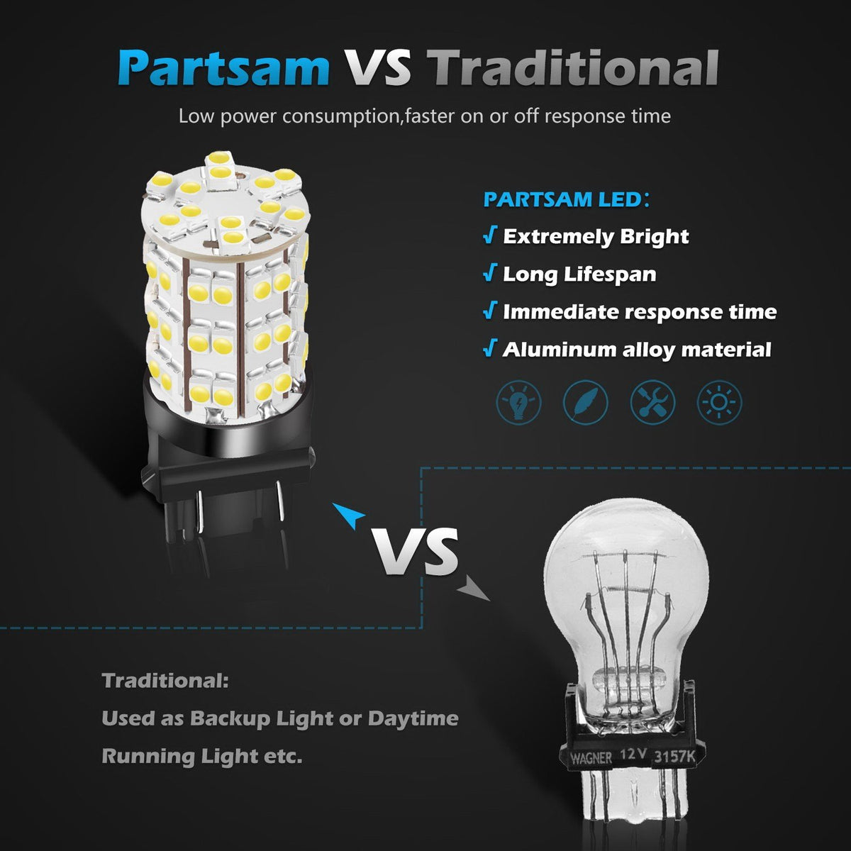 Application on: 3157 3156 4114 3357A 3457A 60-3528-SMD White Hight Power LED cab be used as DRL Daytime Running Light Bulbs. | Notes: 3157 have two types of bulbs, ours is the standard 3157, not CK 3157. | Part # Cross Reference: 3047 3057 3157 3357 3457 4057 4114 4157; Color temperature: 6000K; Housing Material: Aluminum Alloy; LED source: 60-3528-SMD | Long-lasting Life - 50000 working hours, Easy installation- Plug N Play; Faster on/off response time and vibration resistant; If the LED does not light up, simply flip it 180 degrees. | Please check your stock vehicle part number before purchase.Load Resistor will be needed for some car if there is flash after installing this bulb