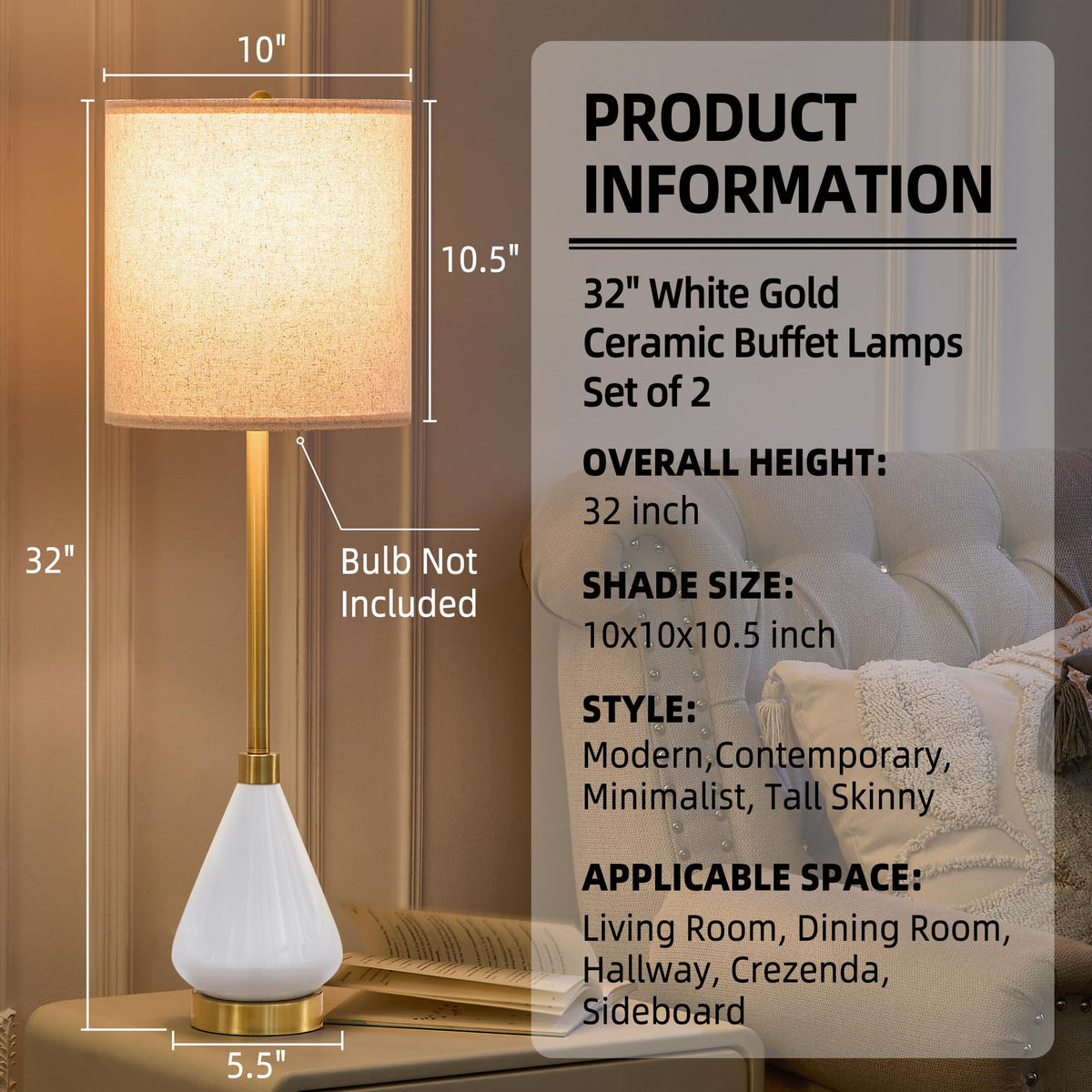 As A Buffet Lamps Set Of 2, Dggdome 30.5'' Blue Ceramic Buffet Lamps Are Made Of Harmless And High-Quality Materials. The Navy Blue Glazed Ceramic Base And Metal Pole Are Used As The Main Lamp Body Of The Tall Lamp, With The Linen Lamp Shade. The Blue Gold Buffet Table Lamps Set Of 2 Is Suitable For Living Room, Bedroom, Office, Study Room, And Other Spaces. The Linen Fabric Makes The Light Softer, Playing An Eye-Caring Role. A 10'' Diameter Lampshade Provides A Wide And Effective Illumination Range, So The Tall Table Lamp Is Also Recommended To Use As A Reading Lamp. The Ceramic Waterdrop Lamp Base Makes The Tall Skinny Candlestick Lamp Very Decorative And High-End. During The Day, The Buffet Lamps Set Of 2 Is A Special Decor. When Night Falls, The Soft Light Creates A Comfortable And Warm Atmosphere For Your Home, Accompanying You And Your Family Through Each Night.