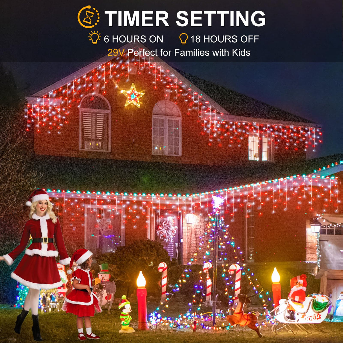 Q: Does the timer function work on these Christmas lights?A: Yes, the 33ft Red and White Christmas Lights come with a convenient timer function. Once activated, they will stay on for 6 hours and then turn off for 18 hours, making it easy to manage your holiday lighting without manual operation.
