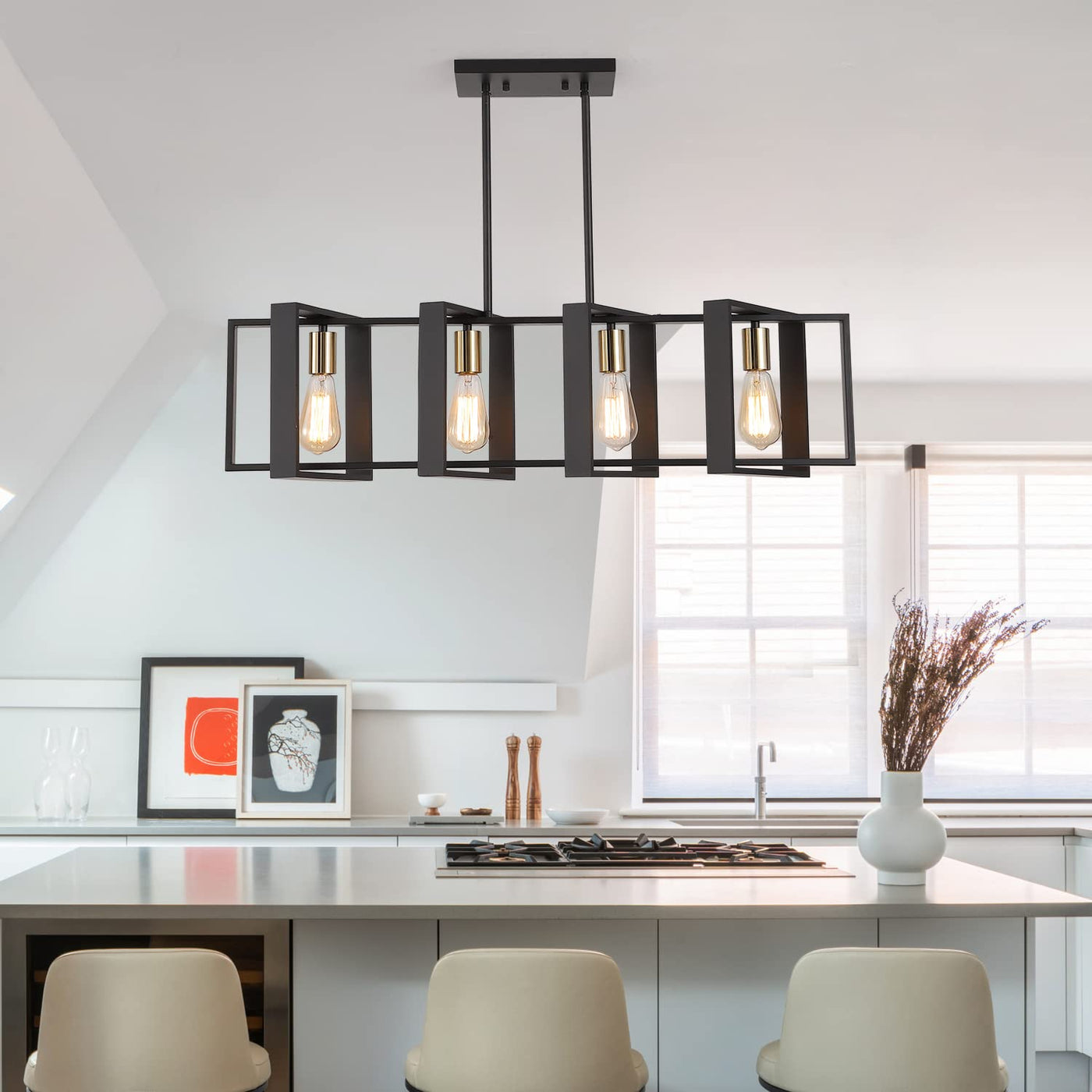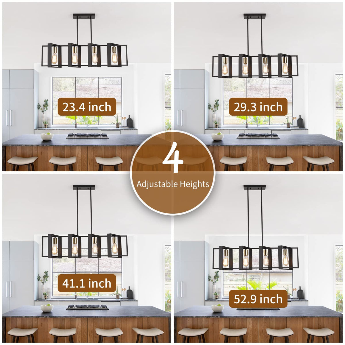 35.4'' Kitchen Island Lighting Fixture,Dining Room 4 Lights Chandeliers,Black Wood+Metal Pendant Light For Foyer Hallway Living