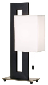Bold geometric lines give this design an expressive modern touch. This contemporary table lamp from the 360 Lighting collection has an open rectangular base in an elegant black finish. Along with a white floating box shade, it offers a unique look that is both dramatic and simple. A single on-off pull chain keeps the profile clean and classy.