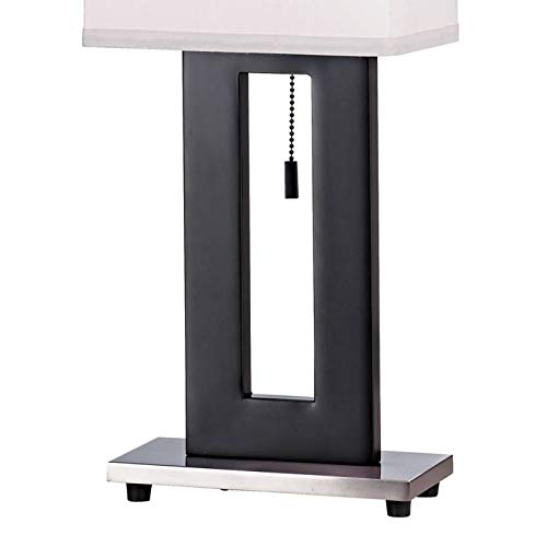 Q: What materials are used in the construction of this lamp?A: This modern table lamp is constructed from metal, featuring a sleek black finish for the body and a brushed nickel footed pedestal.