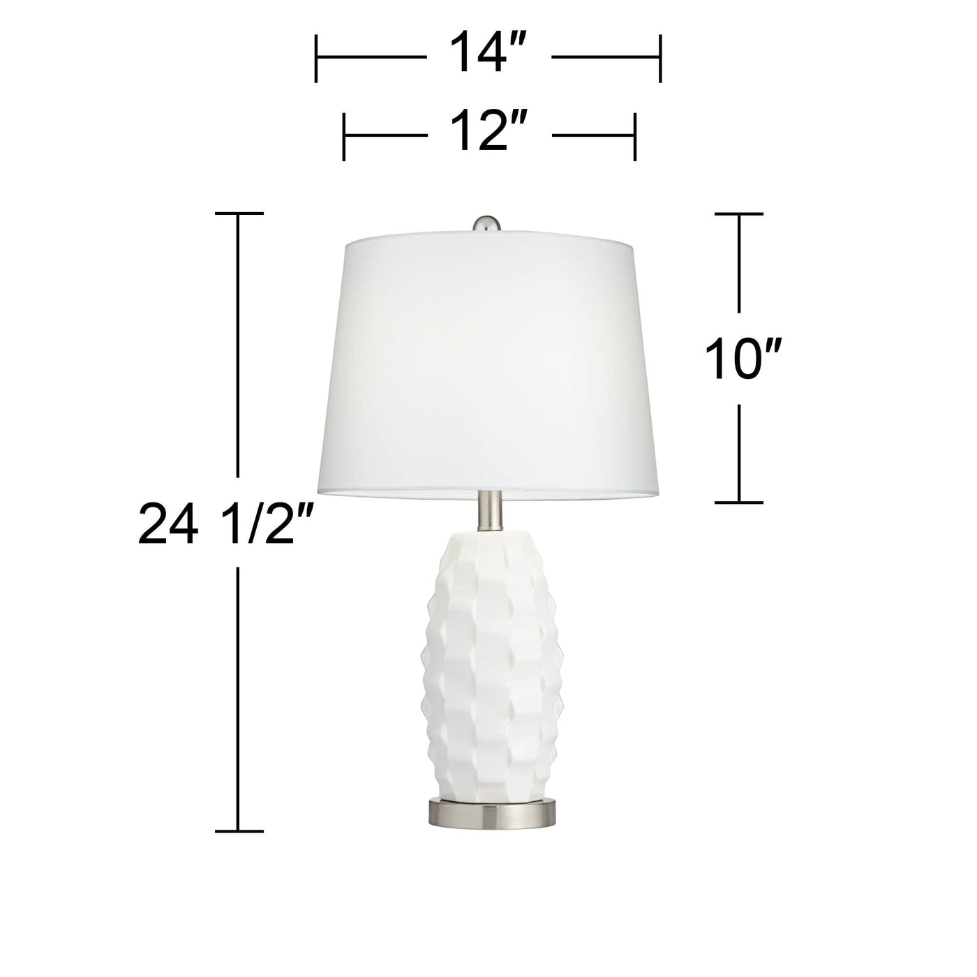 Q: What is the height and width of each lamp?A: Each lamp stands 24.5 inches high and has a base width of 5.5 inches, while the shades measure 12 inches across the top and 14 inches across the bottom.