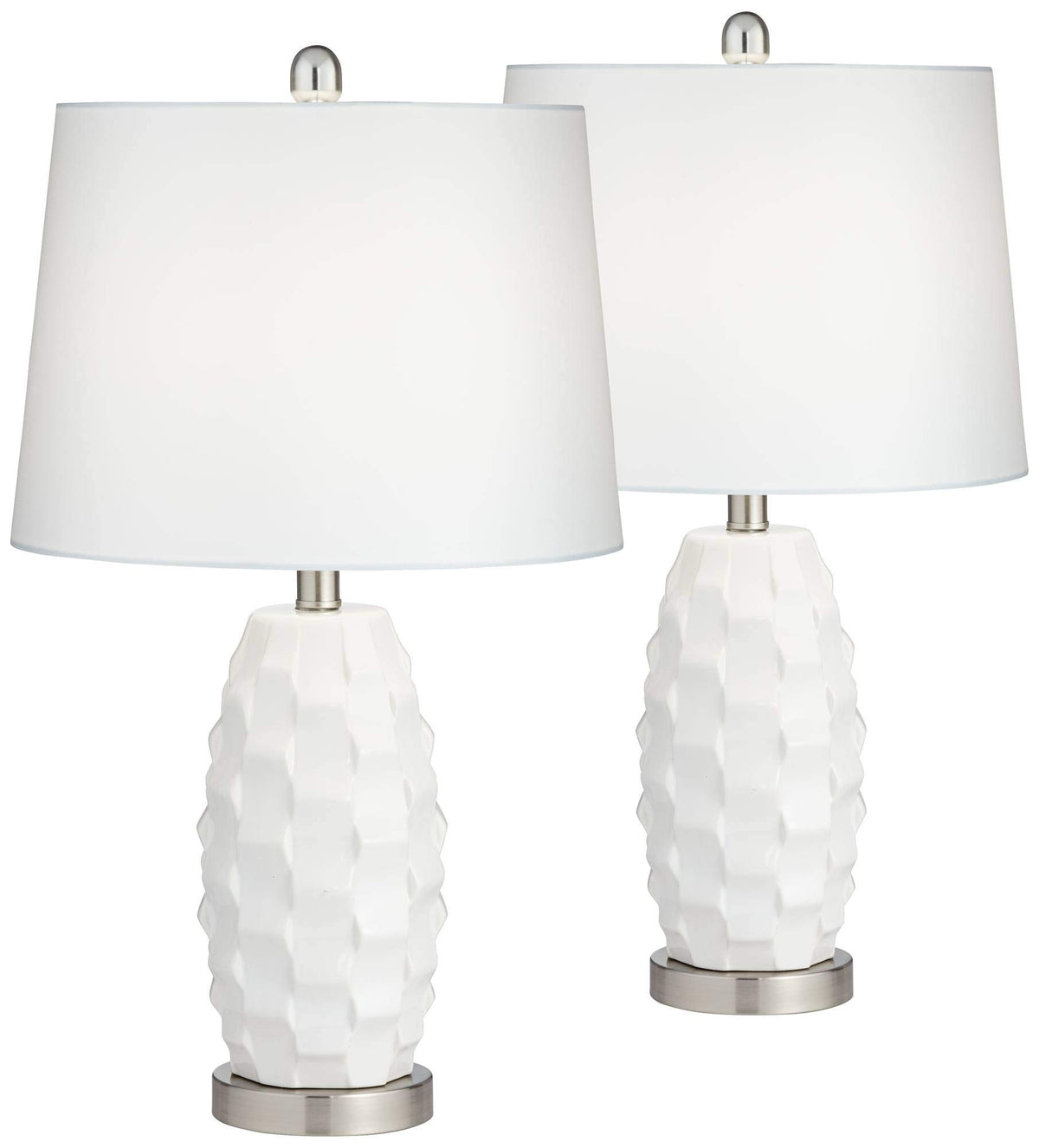Q: What is the material of these table lamps?A: The lamps are made from durable ceramic with a stylish white finish, featuring a scalloped pattern that adds a modern coastal touch to your decor.