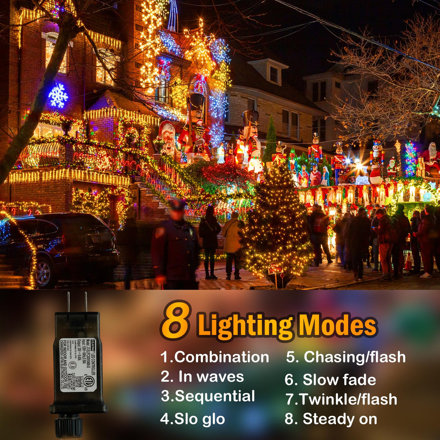 Q: What are the different lighting modes available for the 393FT LED Christmas Lights?A: The 393FT LED Christmas Lights feature 8 different lighting modes: Combination, Wave, Sequence, Slow, Flash, Slow Fade, Flashing, and Always On. This variety allows you to customize the ambiance for any occasion, whether it's a festive holiday gathering or a cozy indoor setting.