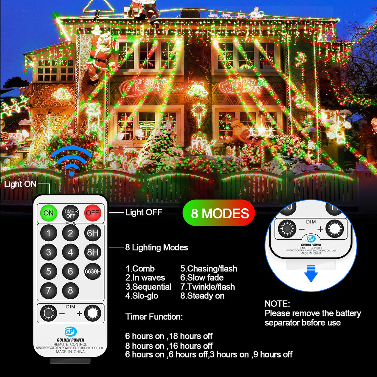 Q: What are the lighting modes available for the 394FT 1000 LED Christmas Lights?A: The 394FT 1000 LED Christmas Lights feature 8 different lighting modes, allowing you to customize the ambiance for your holiday decorations. This includes options like steady on, twinkling, and fading effects to suit various festive occasions.