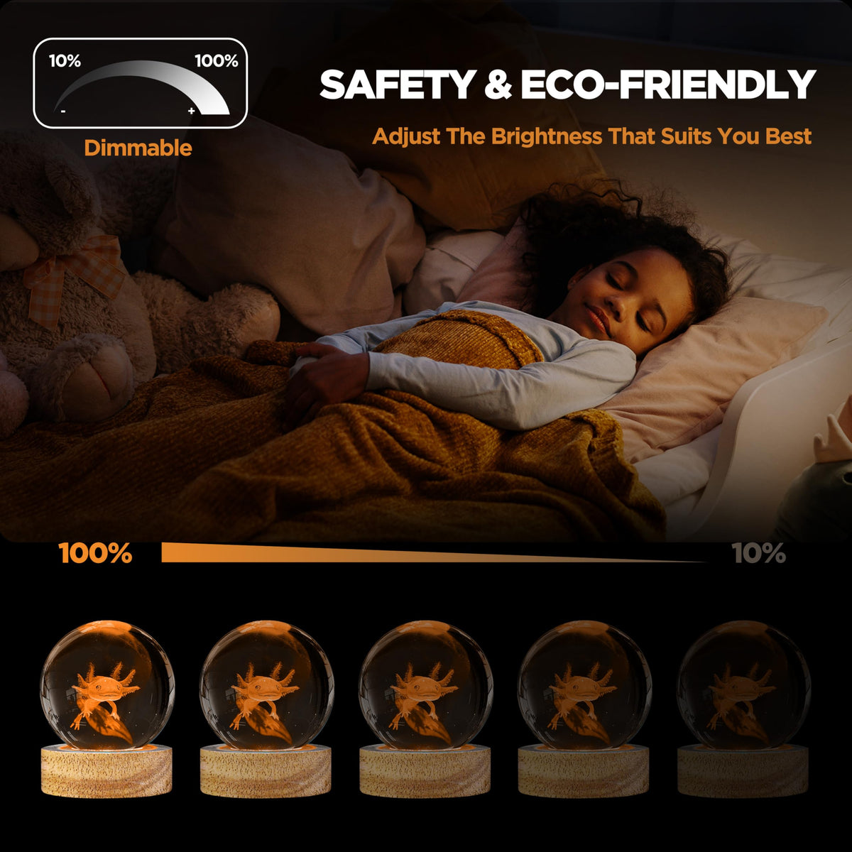 ??3D Axolotl Crystal Ball Lamp With Led Light Base And Remote Control--Perfect Romantic And Mysterious Gift For Your Children, Parents And Loved Ones. ??Specification: -Crystal Material: Upgraded K9 -Base Material: Eco-Friendly Beech Wood -Crystal Size:60Mm/2.36 Inch -Light Color: 16 Colors+4 Modes ??Package Include: 1 X K9 Crystal Ball 1 X Led Wooden Base 1 X Remote Control 1 X Usb Charging Cable 1 X Microfibre Cleaning Cloth 1 X Gift Box ?High-Quality & Upgraded Material Made Of Quality K9 Crystal, It Is Very Clear To Show 3D Axolotl Image Which Is Engraved By Advanced 3D Laser Technology. The 3D Patterns Is Highly Clear And Durable For A Life Use, Crystal Image Will Never Lose Luster. ?Special & Unique 16 Colors These 3D 60Mm Axolotl K9 Crystal Ball Lamp Have 16 Colors And 4 Modes. You Can Use The Remote Control To Choose The Color Of Your Favorite Lights And Adjust The Intensity Of The Lights. Flash, Strobe, Fade And Smooth Four Modes,Can Also Always Light A Color, Soft And Not Glare, Protect Your Eyes. ?Usb Powered, Power Saving 3D Night Light Crystal Lamp Comes With Wooden Base With Usb Cable Line(No Adapter), Connect To Such As Computers, Portable Charger,Output Charger/Adapter,Etc.). Long Life And Power Saving, Can Be Used For Many Years. ??Perfect Gifts For Any Festival In Order To Show The Greatest Sincerity, A Fantastic Crystal Ball And A Luxurious Base Made Of Pure Wood Are Matched With Gift Box Packaging. It Will Make The Best Impression As A Christmas Gift, Mothers Day Gifts, Graduation Gifts, Father'S Day Gifts, Thanksgiving Gifts Or Valentine'S Gift, Birthday Party Or Various Souvenirs. ?Satisfactory Service? Our 3D Axolotl Crystal Ball Night Light Have Been Strictly Tested, You Shouldnt Miss It! If There Is Any Problem, Please Feel Free To Contact Us!