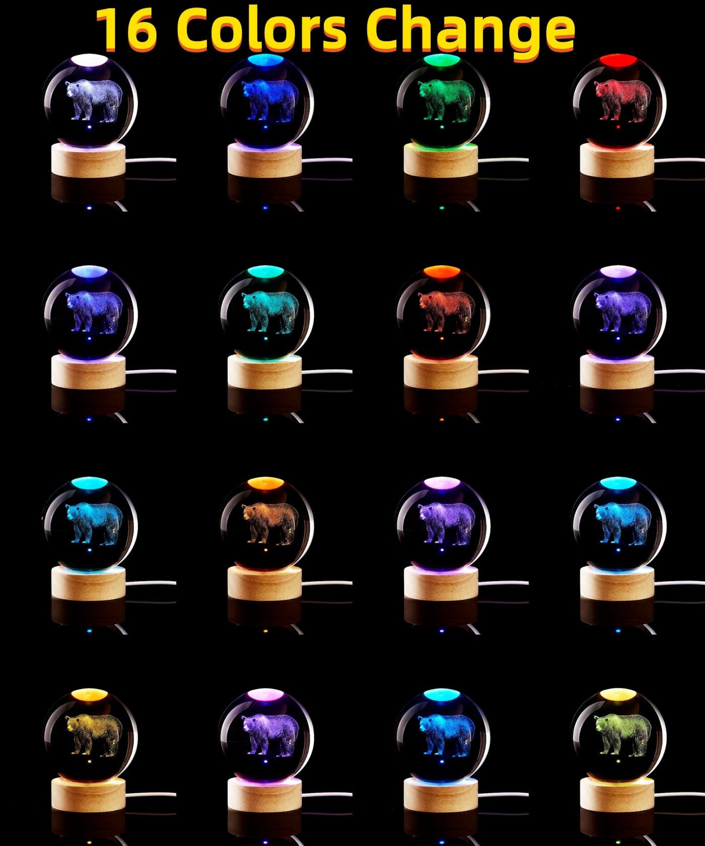 Q: How many colors and lighting modes does the lamp offer?A: The 3D Bear Crystal Ball Lamp features 16 different colors and 4 lighting modes, including flash, strobe, fade, and smooth. You can easily switch between colors and adjust light intensity using the included remote control.