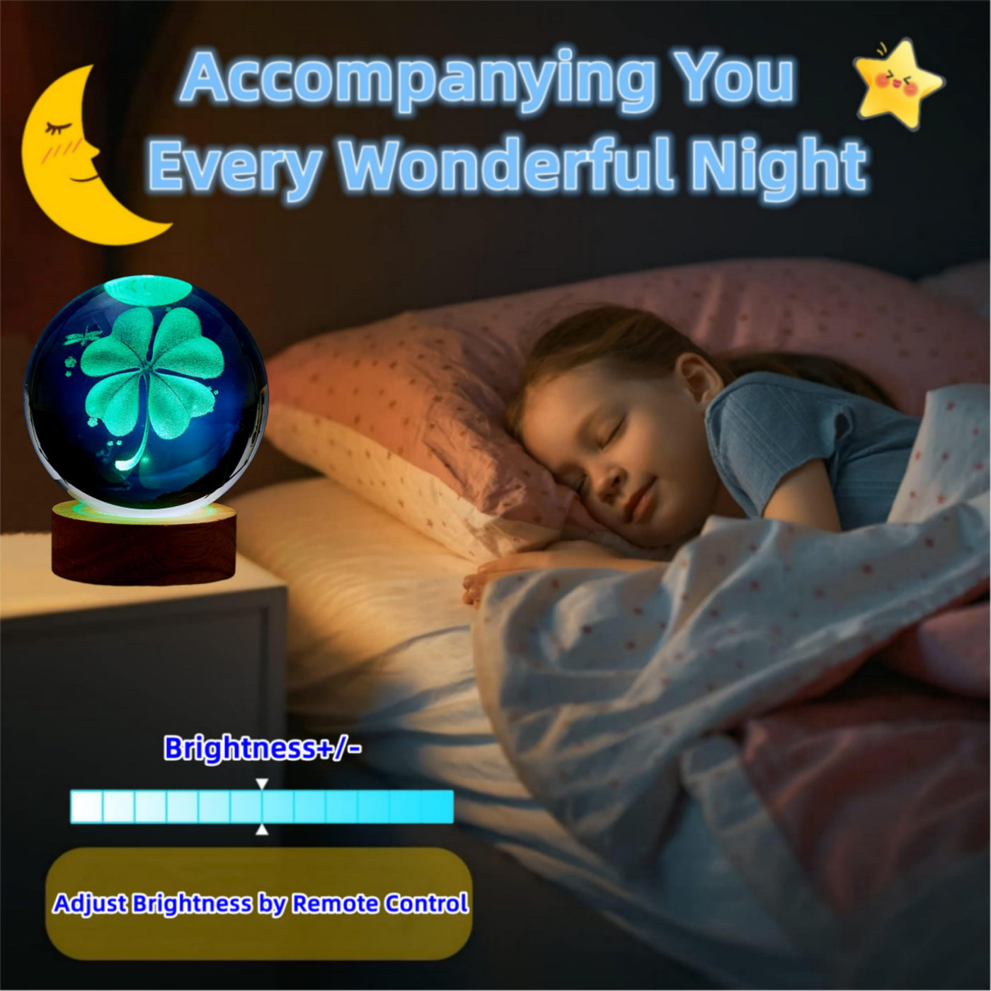 Q: How do I care for the 3D Four-Leaf Clover Crystal Ball Lamp?A: To maintain the clarity and shine of the K9 crystal, clean it with a soft, dry cloth. Avoid using harsh chemicals or abrasive materials that could scratch the surface. Regular cleaning will ensure it remains a stunning centerpiece in your decor.