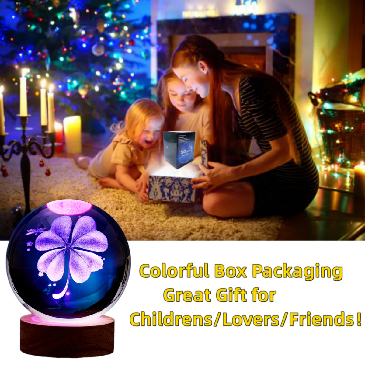 Q: Is the 3D Four-Leaf Clover Crystal Ball Lamp suitable for gifting?A: Yes, this lamp makes an ideal gift for various occasions such as birthdays, holidays, anniversaries, and more. Its unique design and beautiful 3D effect make it a memorable present for loved ones.