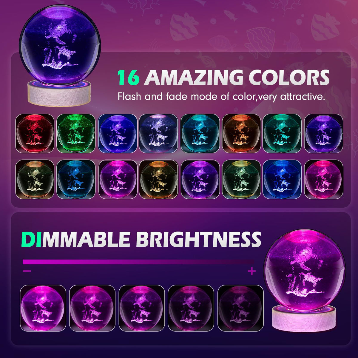 3D Sea Turtle Crystal Ball Night Light with Woodern Base, Large Sea Turtle Glass Ball Lamp 16 Colors with Remote Control Sea Tur