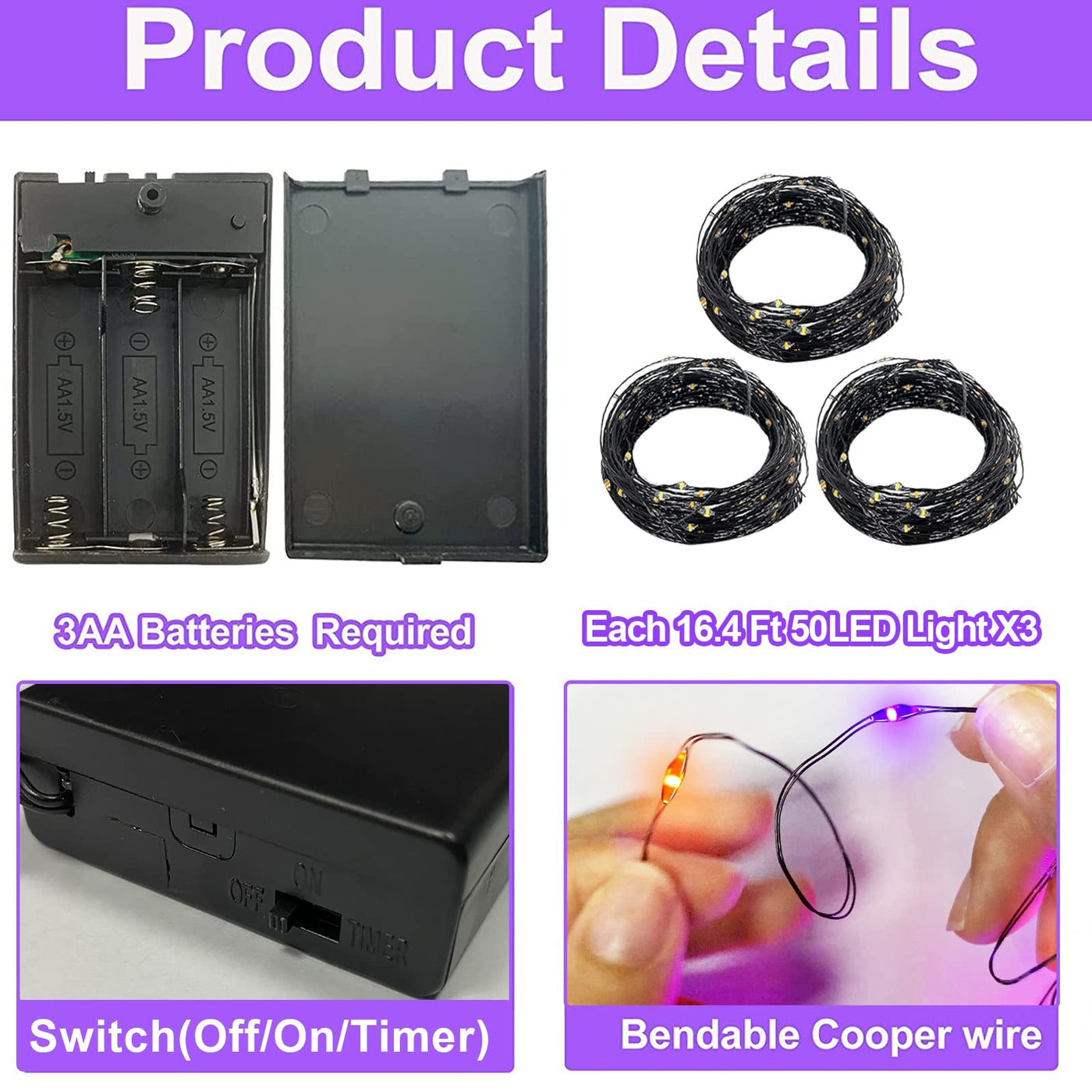 Specifications: String lights length: 16.4 Feet. LED Spacing: 4 inches. Appearance: Copper wire string lights. Number of lights: 50 LED lights. Lighting mode: steady on. Material: PVC + electronic components. Power supply: 3AA batteries(not included). Functions: timer (6 hours on/18 hours off). Widely use: fireplaces, dining tables, bookshelves, doorways, windowsills, outdoor, etc.