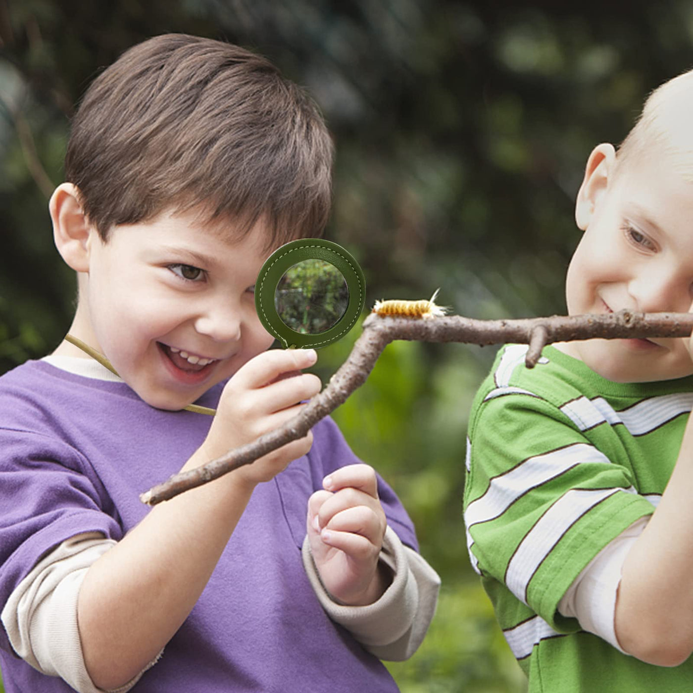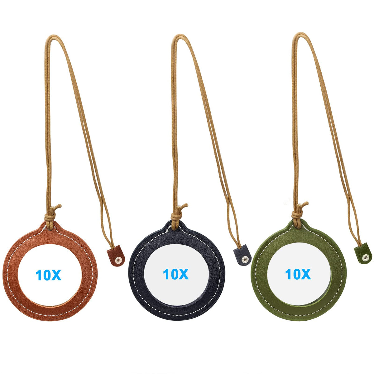 ?High Power Maginfication?There are 3 pieces of magnifying glass necklaces in different colors, available to match your different clothes; This leather necklace magnifying glass provide 10X magnification effect to help people who with low vision see the tiniest details, for easily and clearly reading. It's suitble for elder to read and children to have fun in the outdoors. | ?Drop-resistant Optical Lenses?This 10X magnifying glass necklace uses high quality acrylic lenses and it won't be broken. It's scratch resistant and great clarity, ensures a clear distortion-free image and life-time usage, with 1.9 inch effective diameter,Optical grade magnifying lens covers large viewing area without distortion. | ?Perfect Design?Leather and 30 inches waxed rope Design with acrylic lens make this magnifying glass lightweight and easy to grip. The leather necklace magnifier is compact and portable, you can easily wear it around your neck, without taking up too much space; When you need it, you can get it at once. | ?Durable Material? The magnifying glass is composed of Pu leather, waxed rope, and acrylic lens, non-toxic and safe, sturdy and durable, can be applied for a long time. The acrylic lens helps prevent breakage from accidental dropping, ensures good performance of lens. | ?Practical function? This magnifier necklace can make the object 10 times large, providing an effective way to read books, newspapers, magazines, photographs, maps, electronics, miniatures, jewelry, pill bottles, medications, hobbies, models, and crafts of all kinds. When in need of magnification, it is always easy to fetch. The magnifying glass will bring more fun for kids and motivate them to go outside and explore the nature.