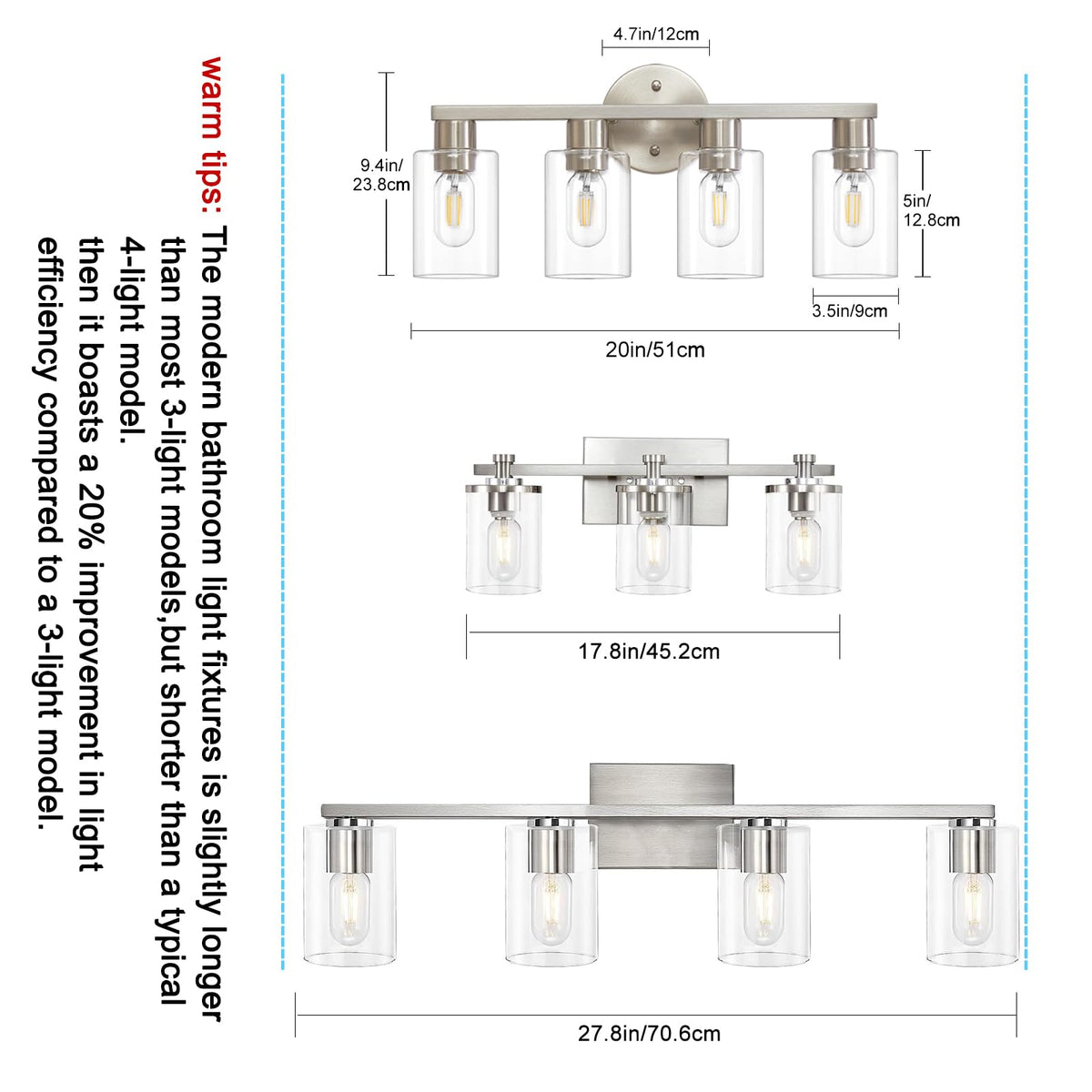 Description:1.This 4 light bathroom vanity light brushed nickel has a dimming function,however, the brushed nickel vanity light requires a compatible dimmable light bulb for optimal performance.2. The brushed nickel bathroom light fixture is easy to install and use. We've provided all necessary components, and assembly is straightforward following the user manual, taking only a few minutes.3. The bathroom light fixtures brushed nickel is rust-resistant and boasts along-lasting lifespan.4. The farmhouse vanity lights for bathroom appear to be of high-end quality and value, which often appeals to buyers seeking a worthwhile investment.5. We ensure that our bathroom mirror lights are packaged securely and neatly to prevent any damage during transit.6. The modern vanity lights for bathroom combines solid stainless steel materials, high-quality and explosion-proof transparent glass. 7. The bathroom light fixtures over mirror is versatile and suitable for various spaces including bathroom,kitchen ceiling, hallway, foyer, entryway,bedroom, living room, balcony, farmhouse, laundry room, garage, dining room etc.8. The bathroom lights over mirror is crafted with UL-certified, fire-resistant ceramic heads and wires, made of metal materials.9, The bathroom vanity lights over mirror is anti-rust and moisture-resistant, with a wire mesh coating for a more textured appearance. They have passed a 220C oven test and will maintain their color even after prolonged use10, The vanity lights is compatible with LED, CFL, and whitepanel lamps (up to 60W, bulb and switch not included). For energy savings, werecommend LED bulbs.