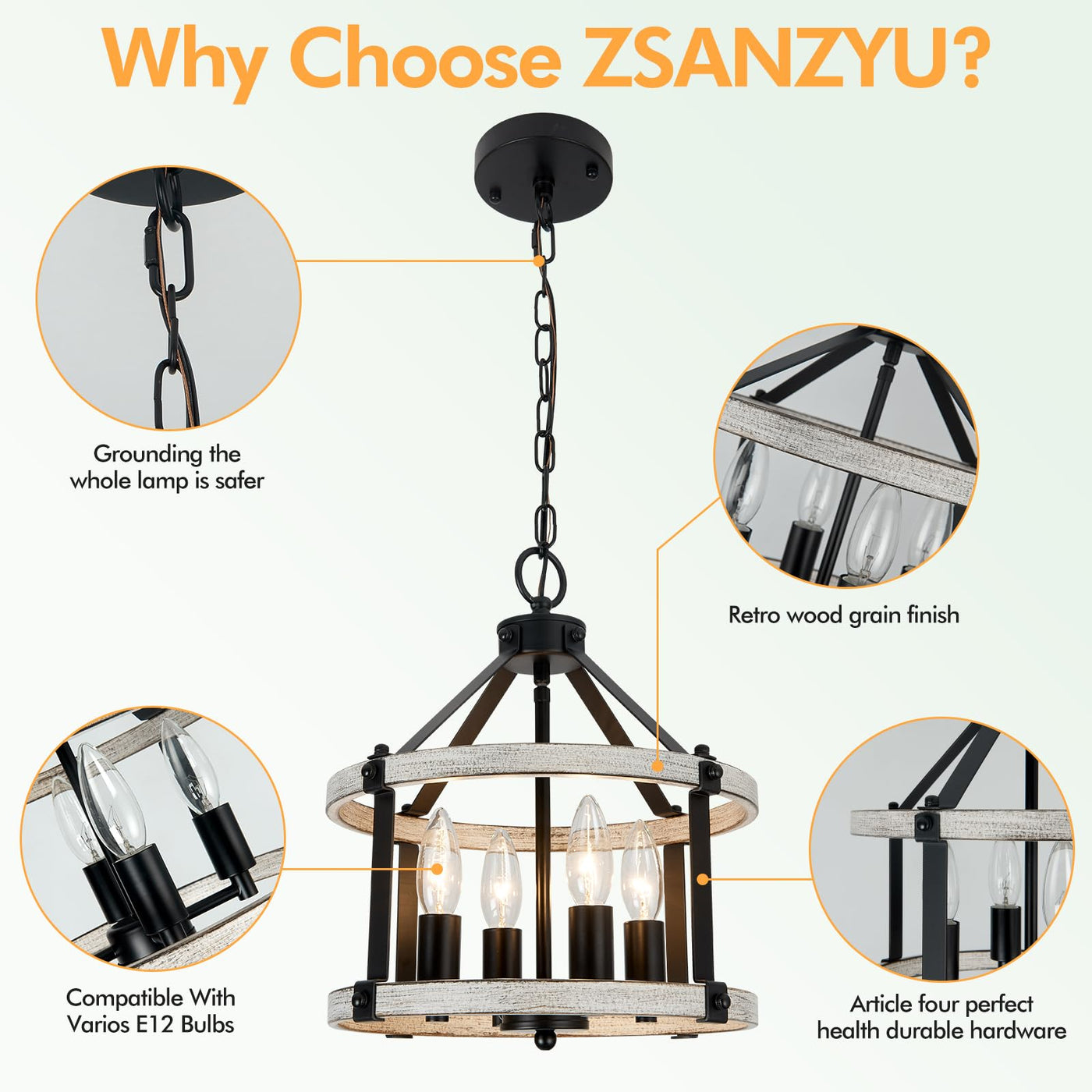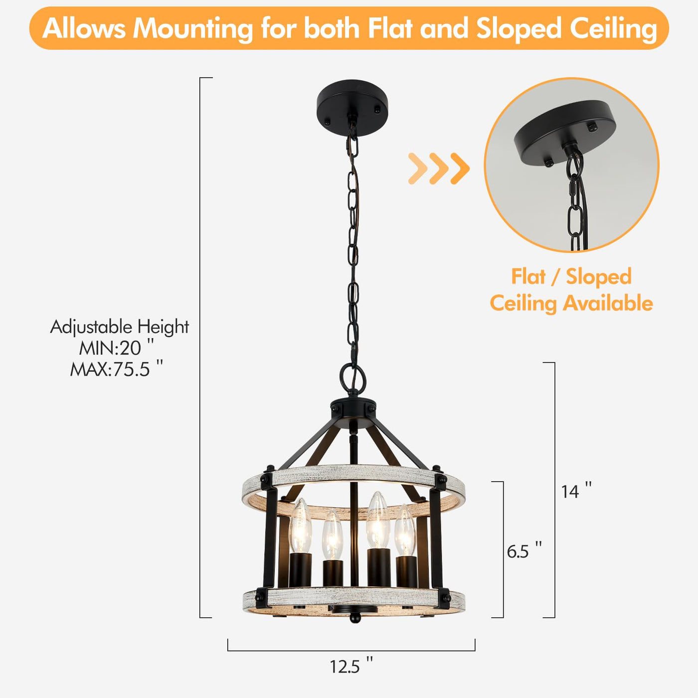 4-Light Farmhouse Chandelier, 12.5 Inch Rustic Black And Vintage Wood Finish Chandeliers For Dining Room Light Fixture, Adjustab