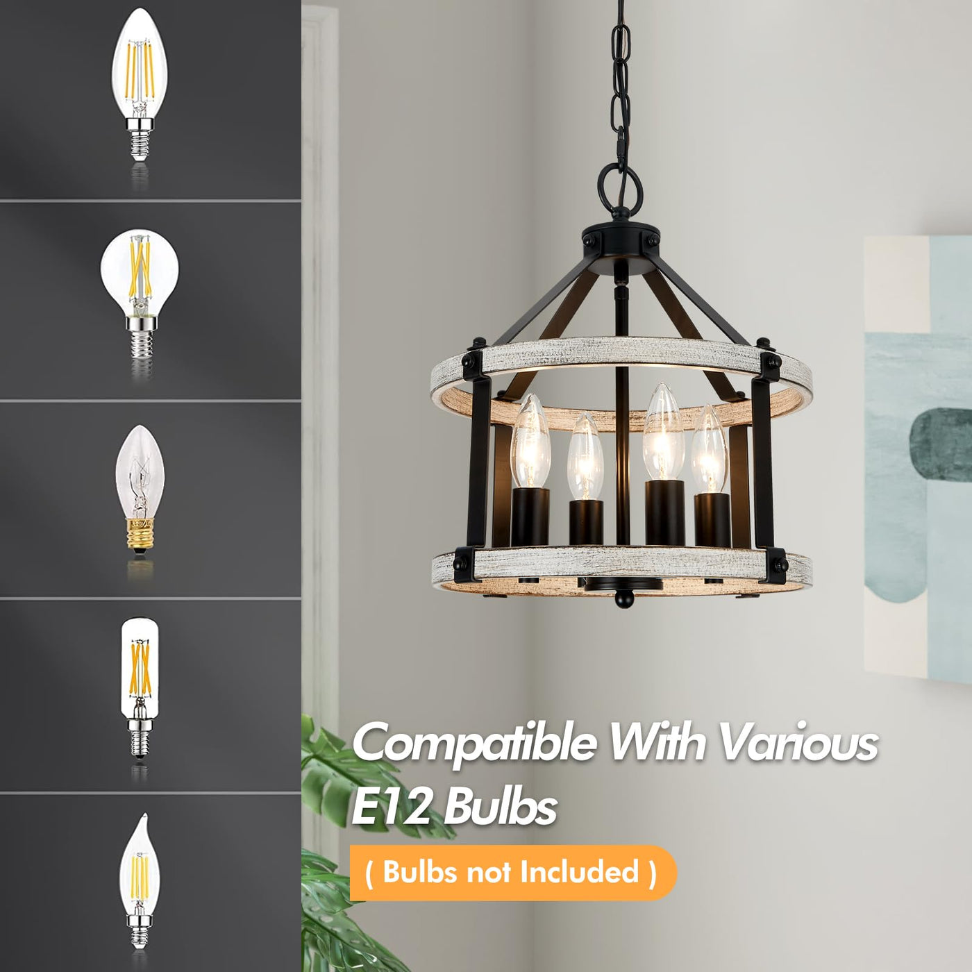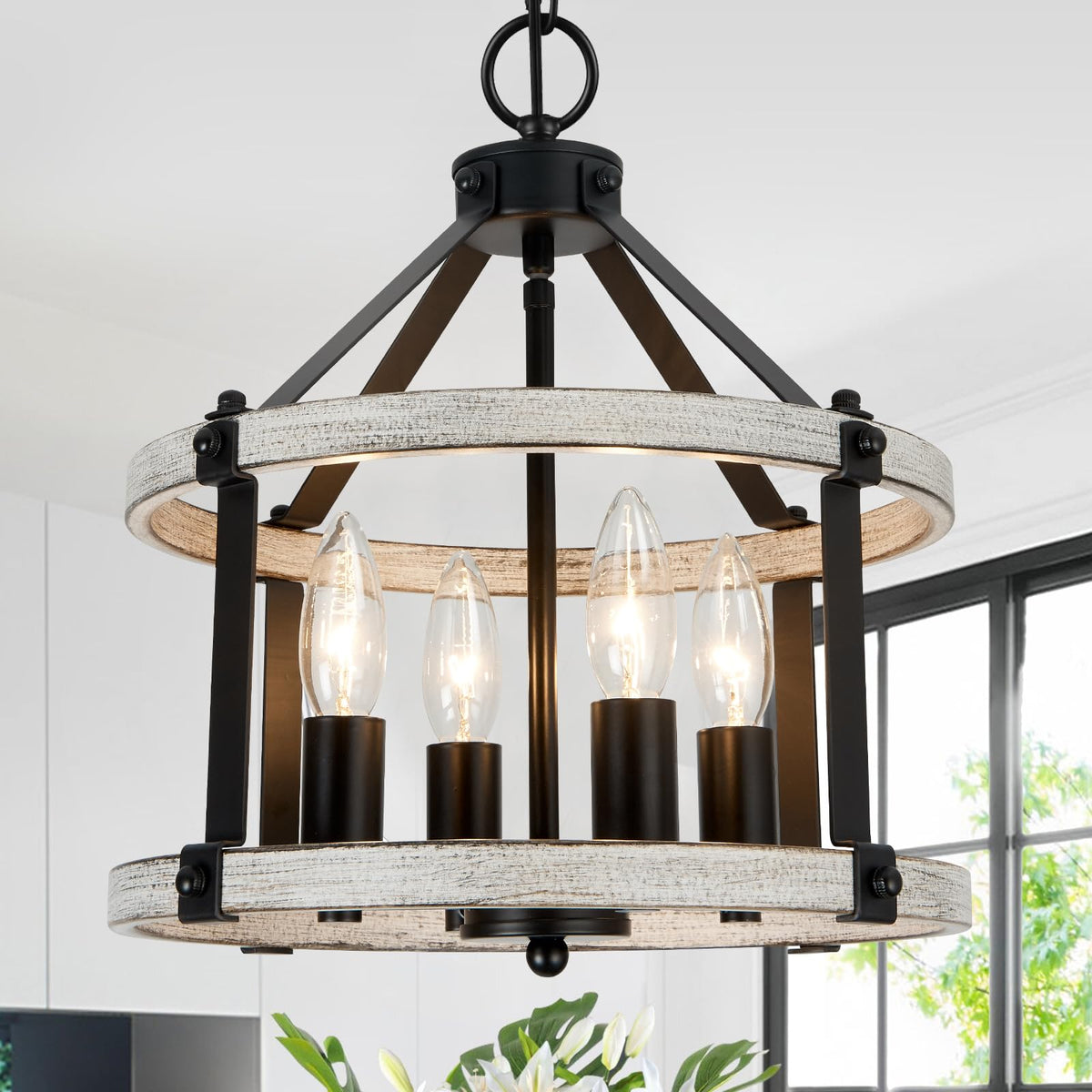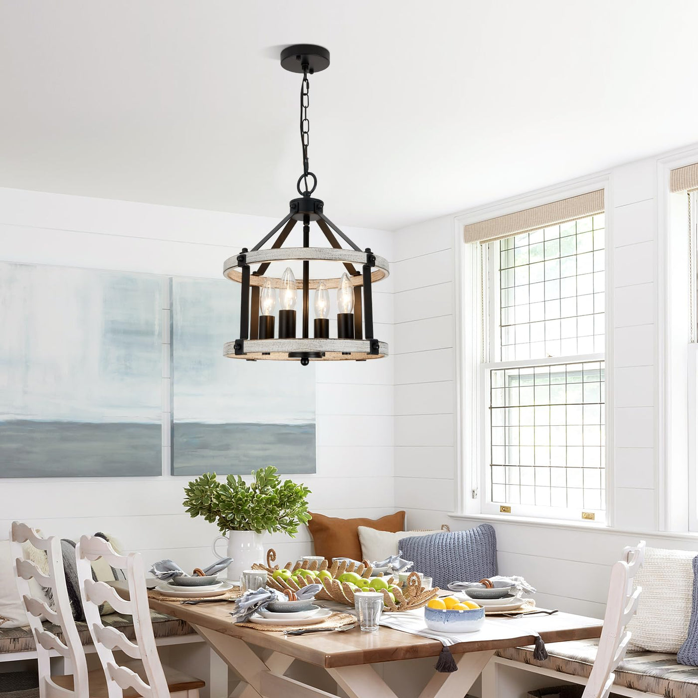 4-Light Farmhouse Chandelier, 12.5 Inch Rustic Black And Vintage Wood Finish Chandeliers For Dining Room Light Fixture, Adjustable Height Hanging Light For Kitchen Island, Entryway, Indoor