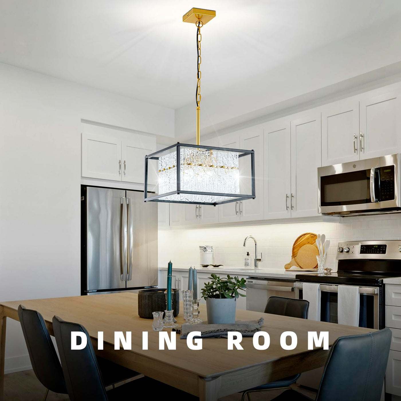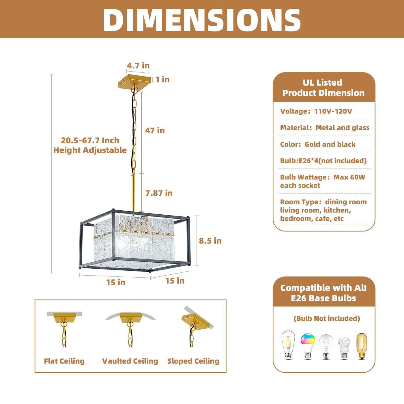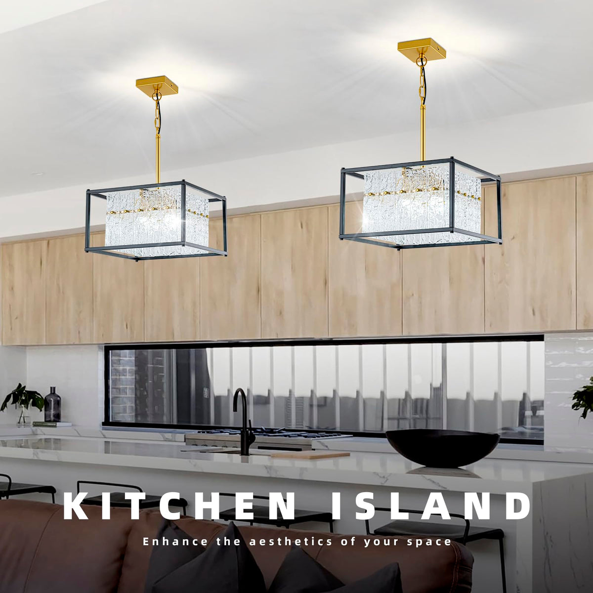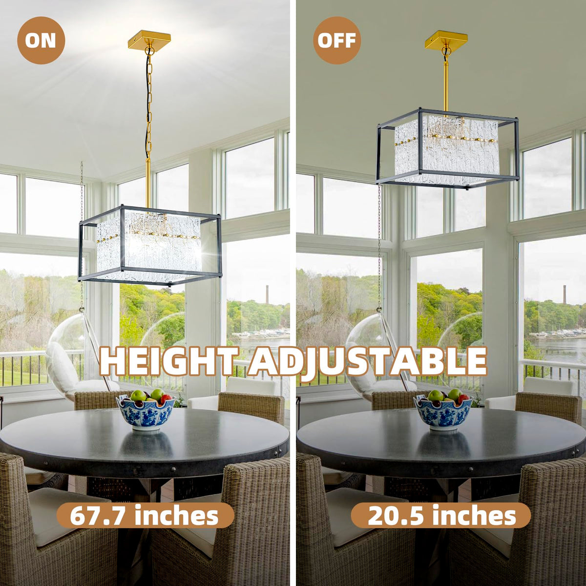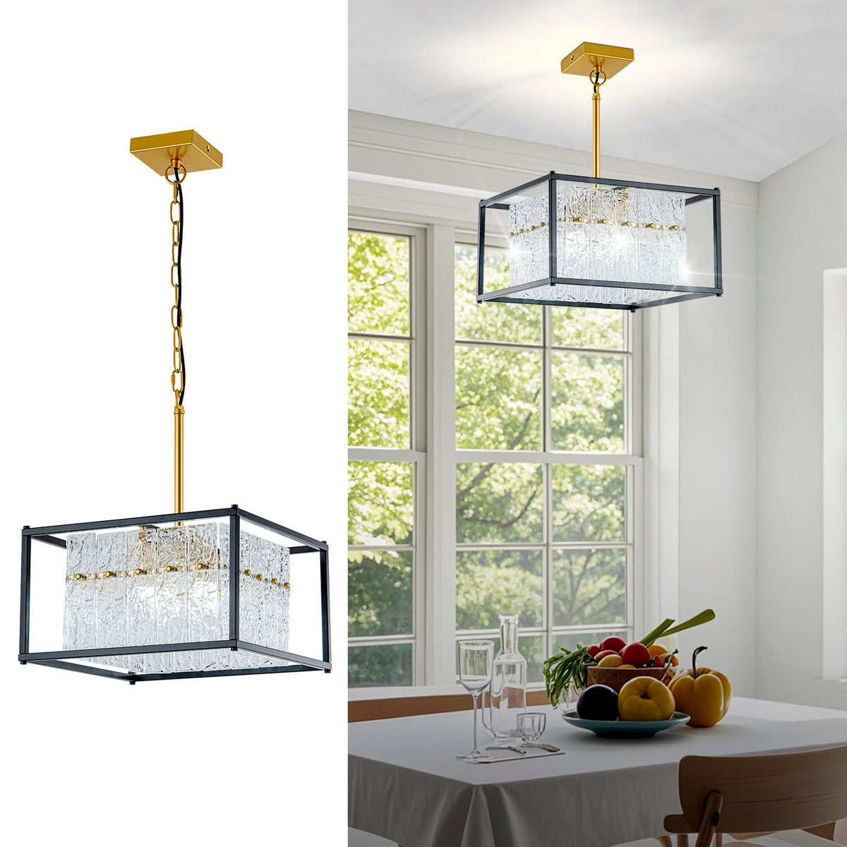 4-Light Modern Square Pendant Light Fixture, Black And Gold Crystal Chandelier With Water Ripple Glass Shades, Farmhouse Adjusta