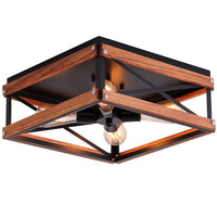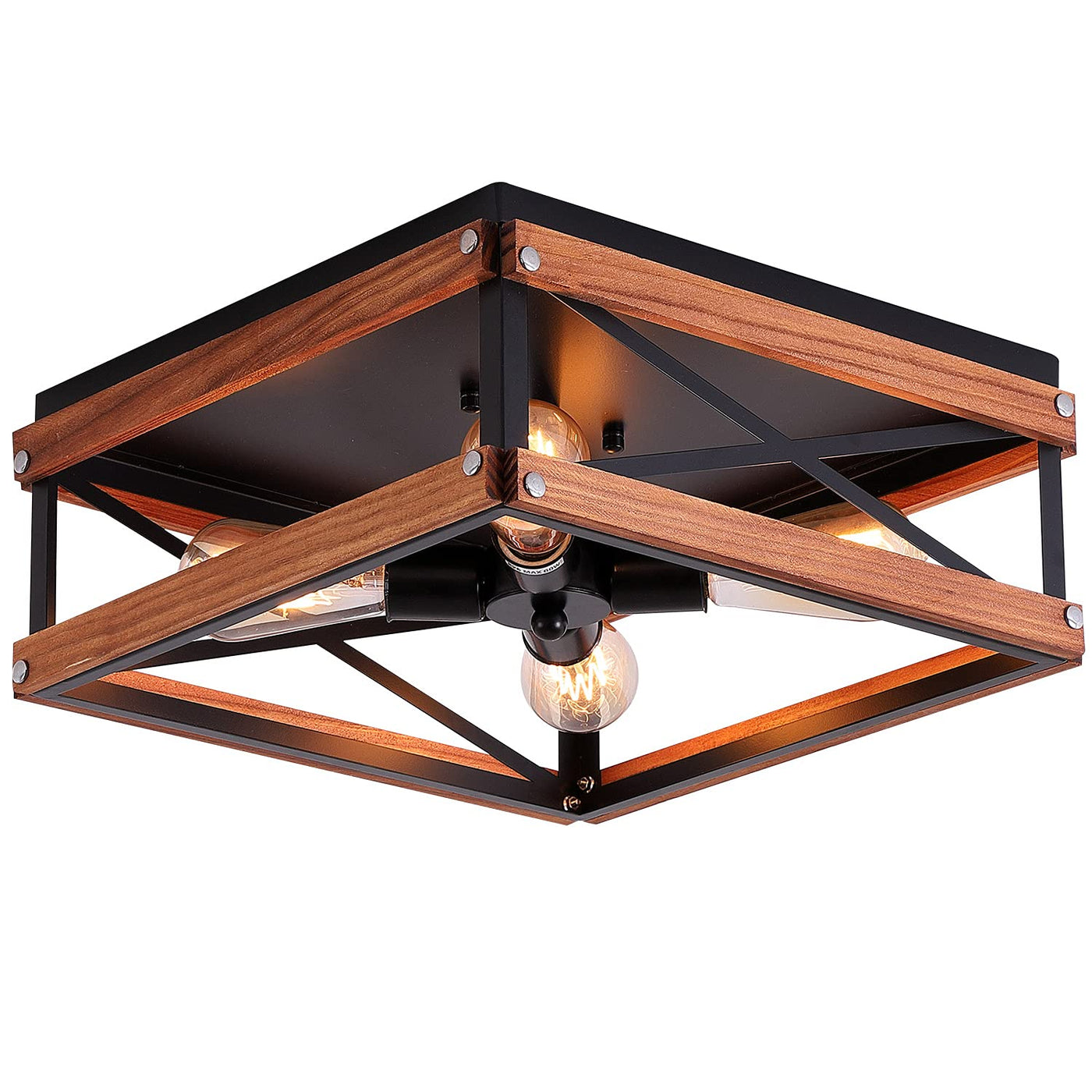 4-Light Rustic Famrhouse Flush Mount Ceiling Light Metal And Wood Square Flush Mount Ceiling Light Fixture For Hallway Bedroom Kitchen Entryway Living Room, Black