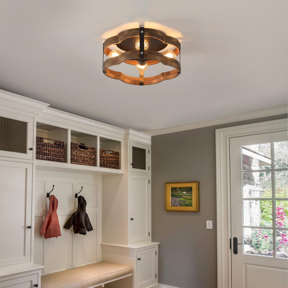 4-Light Rustic Farmhouse Wood Flush Mount Ceiling Light Fixture 14.17 Inch Oak Wood And Metal Cloud Cage Semi Flush Mount Ceilin