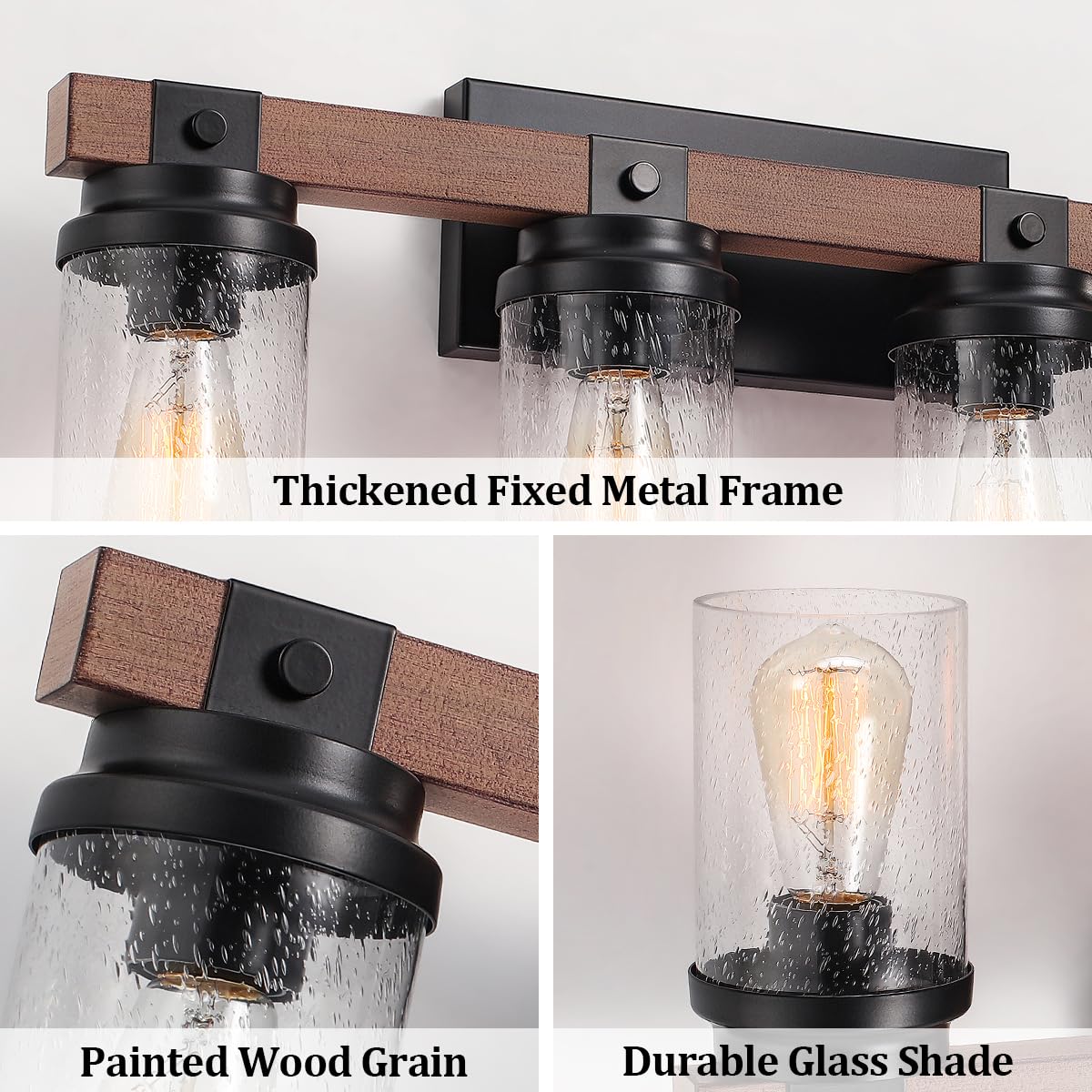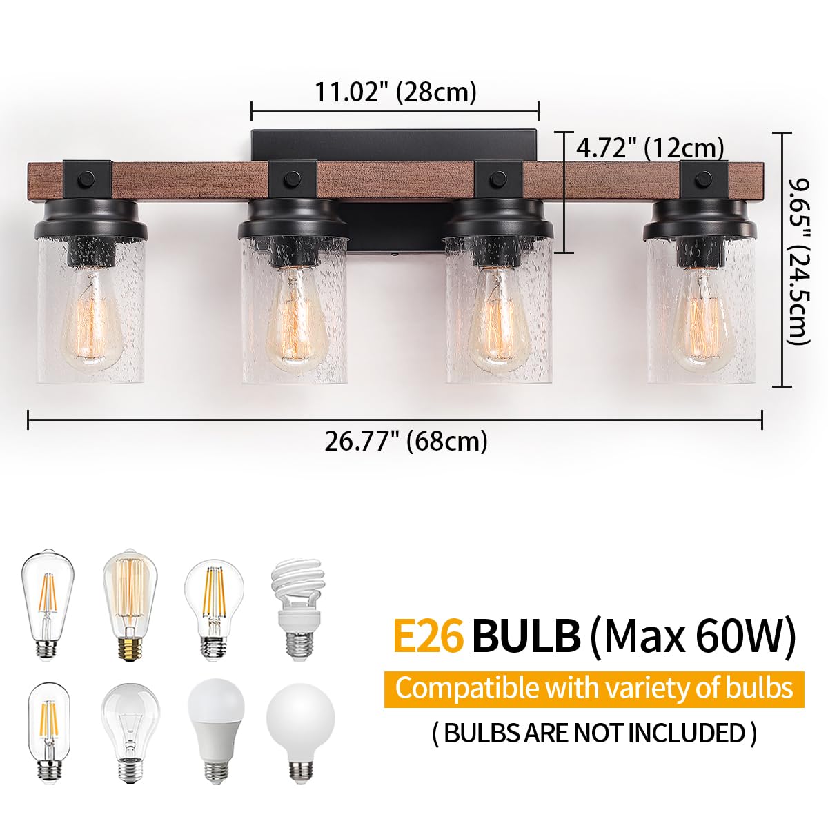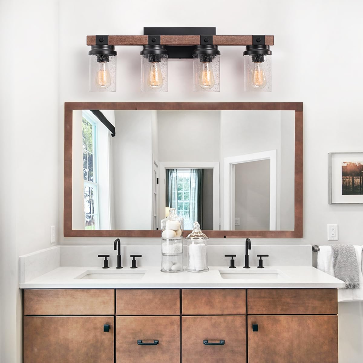 4-Lights Farmhouse Bathroom Vanity Light, Rustic Wood Bathroom Light Fixtures Over Mirror Antique Black Vanity Light With Clear