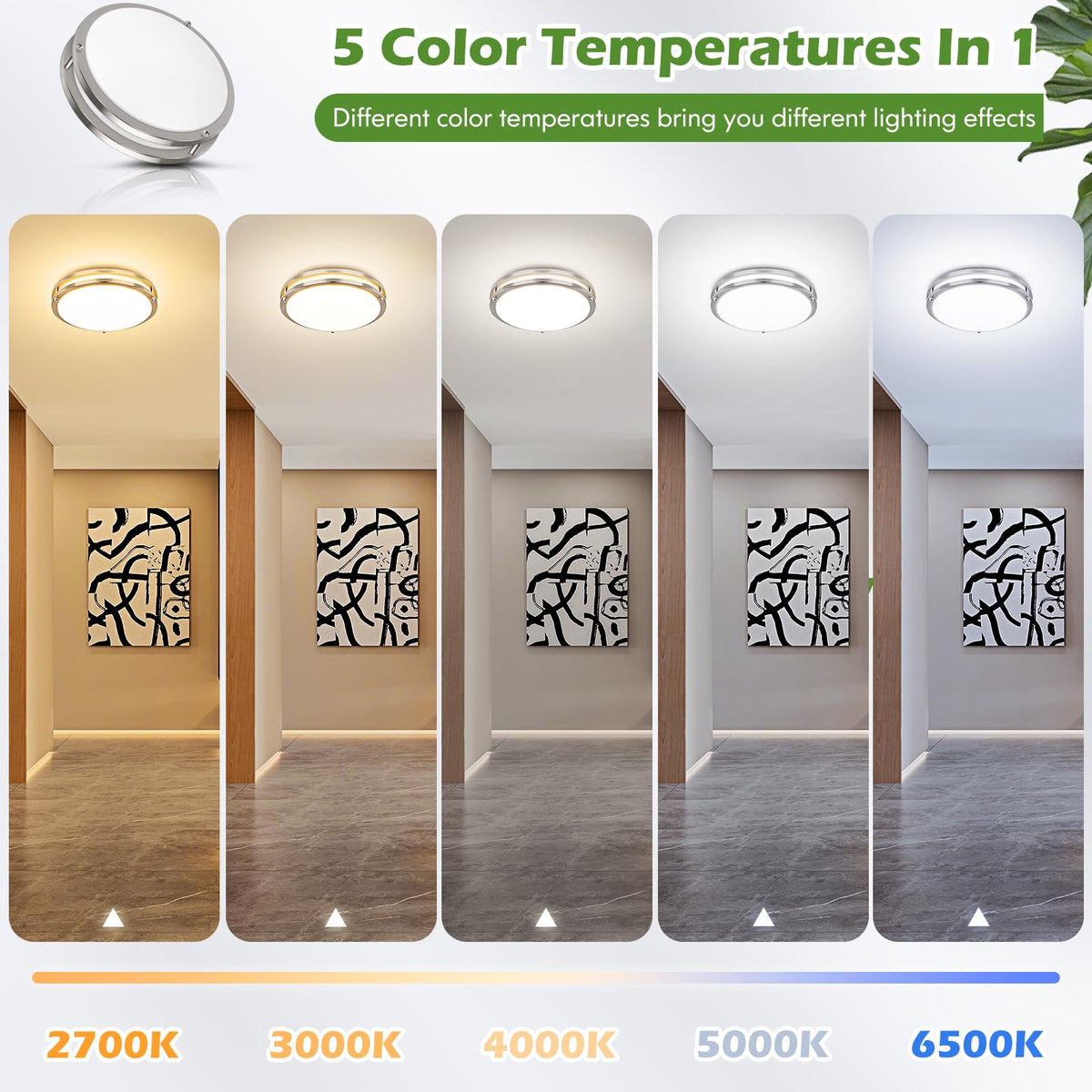 Q: What color temperatures are available for the 4-Pack 12 Inch Dimmable LED Ceiling Lights?A: The 4-Pack 12 Inch Dimmable LED Ceiling Lights feature 5 adjustable color temperatures: 2700K (yellow warm), 3000K (soft white), 4000K (neutral white), 5000K (daylight), and 6500K (ultra-bright), allowing you to create the perfect ambiance for any room.