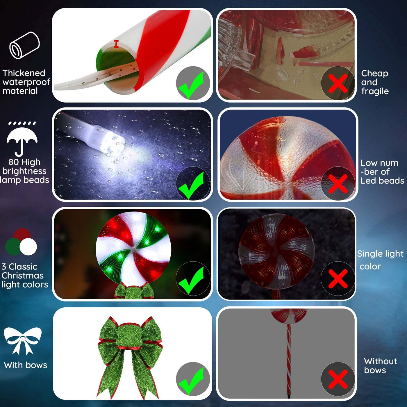 Q: What materials are used in the construction of the pathway lights?A: The Lollipop Peppermint Christmas Pathway Lights are made from thickened plastic material, ensuring durability against various weather conditions and preventing breakage.